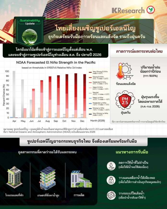 ศูนย์วิจัยกสิกรไทย เปิดเผยถึงรายงานจาก National Oceanic and Atmospheric Administration (NOAA) ฉบับเดือนเมษายน 2026 ที่ชี้ว่าโลกมีแนวโน้มที่จะเข้าสู่สภาวะเอลนีโญตั้งแต่ช่วง พ.ค. 2026 และจะเข้าสู่ภาวะซูเปอร์เอลนีโญช่วง ส.ค. ถึง ปลายปี 2026 ซึ่งอาจส่งผลให้ไทยเผชิญกับภัยร้อนและแล้งจัด โดยคาดการณ์ว่าปริมาณฝนในปีนี้จะอยู่ที่ 1,479 มิลลิเมตร ลดลงจากปีก่อนราว 18.6% ที่ 1,816 มิลลิเมตร และปัญหาฝุ่นพิษ PM2.5 จากหมอกควันข้ามพรมแดนอาจรุนแรงขึ้น โดยเฉพาะภาคใต้ ในช่วง ก.ค. – ก.ย. 2026