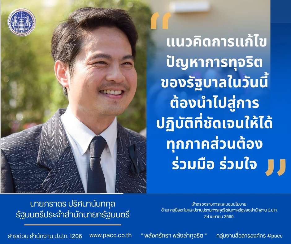วันที่ 24 เมษายน 2569 นายภราดร ปริศนานันทกุล รัฐมนตรีประจำสำนักนายกรัฐมนตรี ในฐานะได้รับมอบหมายหรือมอบอำนาจให้สั่งและปฏิบัติราชการแทนนายกรัฐมนตรี ในการกำกับดูแลสำนักงานคณะกรรมการป้องกันและปราบปรามการทุจริตในภาครัฐ (สำนักงาน ป.ป.ท.) เข้าตรวจราชการและมอบนโยบายด้านการป้องกันและปราบปรามการทุจริตในภาครัฐของสำนักงาน ป.ป.ท. พร้อมทั้งรับฟังผลการดำเนินงาน ปัญหาอุปสรรค และแนวทางการขับเคลื่อนภารกิจด้านการป้องกันและปราบปรามการทุจริตของหน่วยงาน โดยมี นายภูมิวิศาล เกษมศุข เลขาธิการคณะกรรมการ ป.ป.ท. นายเอกชัย เกษมสุขธวัช รองเลขาธิการคณะกรรมการ ป.ป.ท. พันตำรวจโท สิริพงษ์ ศรีตุลา รองเลขาธิการคณะกรรมการ ป.ป.ท. พร้อมด้วยคณะผู้บริหารและเจ้าหน้าที่สำนักงาน ป.ป.ท. ทั้งส่วนกลาง และ ปปท. เขต 1-9 เข้าร่วมฯ ณ ห้องประชุม 1 ชั้น 28 สำนักงาน ป.ป.ท. อาคารซอฟต์แวร์ปาร์ค จังหวัดนนทบุรี และผ่านสื่อระบบอิเล็กทรอนิกส์ Zoom Meeting