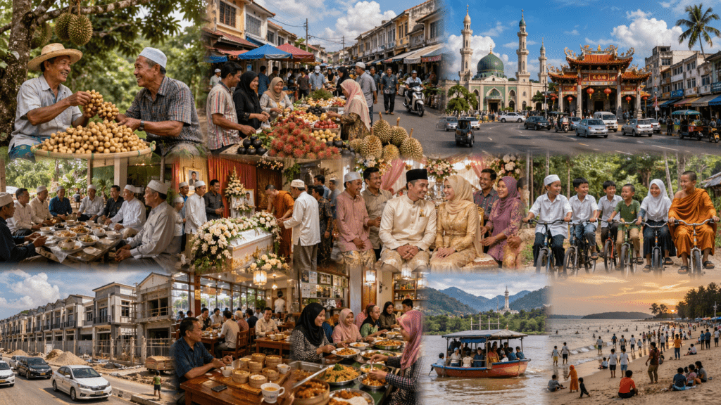 ช่วงเก็บเกี่ยวผลผลิตจะมีผลไม้อย่างหลากหลาย อาทิ ทุเรียน มังคุด เงาะ ลางสาด และลองกอง จะนำไปวางตามตลาดเขตเมือง รวมถึงมีพ่อค้าจากต่างถิ่นเข้าไปซื้อถึงสวน และที่พิเศษคือลองกอง จากตันหยงมัส อ.ระแงะ นราธิวาส รสชาติอร่อยเป็นที่ต้องการของตลาดและมีราคาแพง เจ้าของสวนบรรจุกล่องส่งขายทั่วประเทศ ผลผลิตทางการเกษตรสร้างรายได้ให้กับพุทธและมุสลิม มีฐานะความเป็นอยู่ที่ดี และช่วงนั้นภาพกิจกรรมที่ปรากฏให้เห็นถึงความเอื้อเฟื้อและสามัคคี จะร่วมงานบุญกันแบบไม่ขาดตกบกพร่อง งานศพชาวพุทธจะมีชาวมุสลิมมาร่วมไว้อาลัย งานศพชาวมุสลิมจะมีชาวพุทธร่วมไว้อาลัย รวมถึงงานแต่งลูกหลาน จะเห็นการแต่งกายที่กลมกลืนกัน ตามประเพณีของแต่ละศาสนา