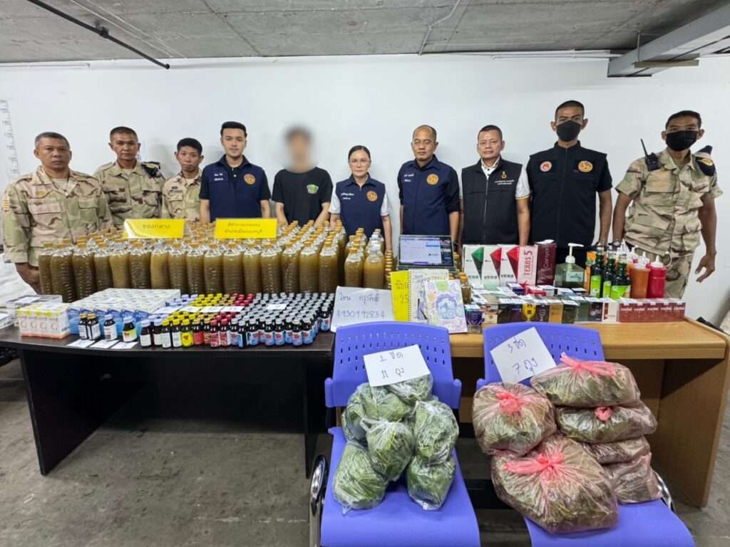 จากการลงพื้นที่ตรวจสอบ พบว่าร้านดังกล่าวยังคงเปิดให้บริการตามปกติ มีประชาชนเข้าออกอย่างต่อเนื่อง เจ้าหน้าที่จึงแสดงตัวเข้าตรวจค้น พบของกลางจำนวนมาก ได้แก่ น้ำกระท่อม 215 ขวด ใบกระท่อม 3 กิโลกรัม บุหรี่ 152 ซอง ยาแก้ปวด 52 แผง ยาแก้ไอ 92 ขวด ยาแก้แพ้ 56 ขวด และหัวเชื้อน้ำหวาน 18 ขวด