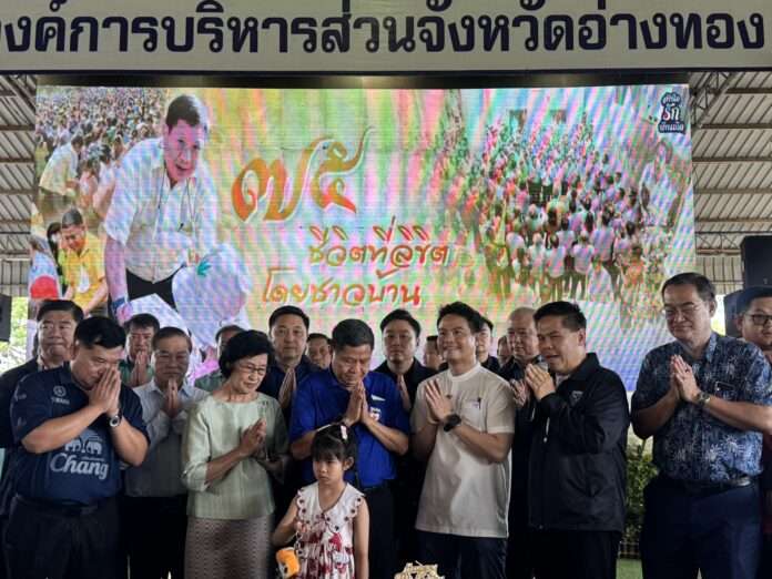 อ่างทอง, วันที่ 26 เมษายน – นายวราวุธ ศิลปอาชา รมว.อุตสาหกรรม พร้อมด้วย นายจองชัย เที่ยงธรรม อดีตรมช.คมนาคม และอดีตรองหัวหน้าพรรคชาติไทย นายนพดล มาตรศรี ที่ปรึกษา รมว.อุตสาหกรรม นายนิกร จำนง สส.แบบบัญชีรายชื่อ พรรคภูมิใจไทย นายณัฐวุฒิ ประเสริฐสุวรรณ นายสรชัด สุจิตต์ นายเสมอกัน เที่ยงธรรม สส.สุพรรณบุรี พรรคภูมิใจไทย เข้าอวยพร นายสมศักดิ์ ปริศนานันทกุล อดีตรองประธานสภาผู้แทนราษฎร อดีต รมว.เกษตรและสหกรณ์ และ รองหัวหน้าพรรคชาติไทย เนื่องในโอกาสวันเกิดครบรอบ 75 ปี ที่โดมอเนกประสงค์ องค์การบริหารส่วนจังหวัดอ่างทอง โดยมีครอบครัวปริศนานันทกุลให้การต้อนรับอย่างอบอุ่น ทั้งนางรวีวรรณ มารดาของ นายภราดร ปริศนานันทกุล รัฐมนตรีประจำสำนักนายกรัฐมนตรี นายกรวีร์ ปริศนานันทกุล สส.อ่างทอง พรรคภูมิใจไทย และประธานวิปรัฐบาล นายภคิน ปริศนานันทกุล อดีต สส.พรรคชาติไทยพัฒนา นางสาวธนยา ปริศนานันทกุล บุตรสาวคนสุดท้องของนายสมศักดิ์-นางรวีวรรณ