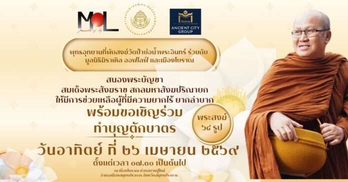 พุทธอุทยานที่พักสงฆ์วัดป่าบ่อน้ำพระอินทร์ ร่วมกับมูลนิธิมิราเคิล ออฟ ไลฟ์ และเมืองโบราณ จังหวัดสมุทรปราการ จัดกิจกรรมทำบุญตักบาตรพระสงฆ์จำนวน 64 รูป เมื่อเช้าวันอาทิตย์ที่ 26 เมษายน 2569 ณ เมืองโบราณ ตำบลบางปูใหม่ อำเภอเมืองสมุทรปราการ