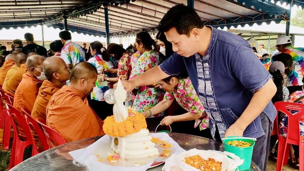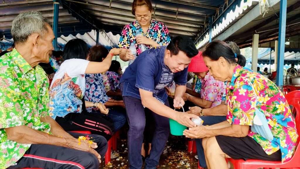 ต่อด้วยพิธีที่เปี่ยมไปด้วยรอยยิ้มและคราบน้ำตาแห่งความปิติ คือ “พิธีรดน้ำขอพรผู้สูงอายุ” เนื่องในเทศกาลสงกรานต์ นำโดย นายชูศักดิ์ พรนิมิตทรัพย์ ผู้ใหญ่บ้านหมู่ 9 พร้อมการมอบข้าวสารอาหารแห้งเพื่อเป็นขวัญและกำลังใจแก่ผู้สูงวัยในหมู่บ้าน ตอกย้ำการดูแลกันและกันของคนในชุมชนที่ “ไม่ทิ้งใครไว้ข้างหลัง”