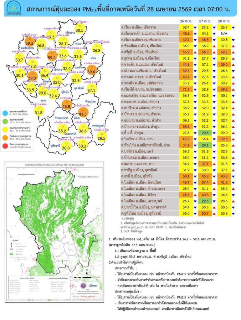กรุงเทพฯ, วันที่ 28 เม.ย. – ศูนย์สื่อสารการแก้ไขปัญหามลพิษทางอากาศ (ศกพ.) กรมควบคุมมลพิษ รายงานการติดตามสถานการณ์ฝุ่น PM2.5 วันที่ 28 เมษายน 2569 ณ 07:00 น กรุงเทพมหานครและปริมณฑลอยู่ในเกณฑ์ดี ภาพรวม 17 จังหวัดภาคเหนือ กลับเข้ามาอยู่ในเกณฑ์มาตรฐานเกือบทุกพื้นที่แล้ว โดยเฉพาะบริเวณภาคเหนือตอนบน อย่างไรก็ตามยังคงมีบางพื้นที่ที่เกินค่ามาตรฐานอยู่ในระดับสีส้ม ประเทศไทยมีโอกาสเกิดฝนในหลายพื้นที่ในช่วงวันที่ 29–30 เมษายน นี้ (ทั้งนี้หลังวันที่ 28 เม.ย. อัตราการระบายอากาศมีแนวโน้มลดลงบางจังหวัดบริเวณภาคเหนือตอนบน)