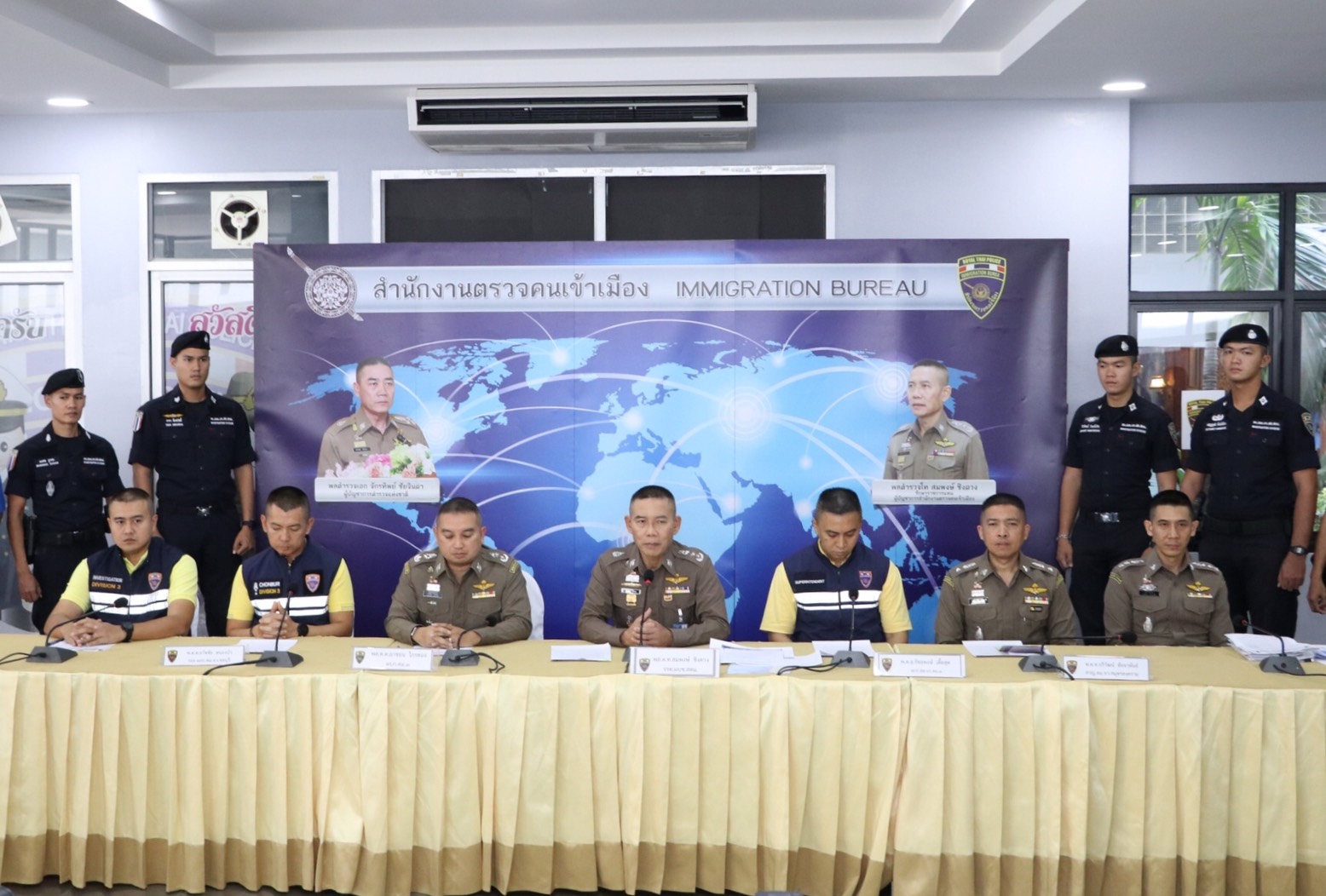 ที่ห้องแถลงข่าว สตม.สวนพลู พลตำรวจโท สมพงษ์ ชิงดวง รักษาราชการแทนผู้บัญชาการสำนักงานตรวจคนเข้าเมือง (รรท.ผบช.สตม.) พร้อมด้วย พลตำรวจตรี ภาคภูมิภิภัทฒ์ สัจจพันธุ์,พลตำรวจตรี กฤษกร พลีธัญญวงศ์,พลตำรวจตรี อิทธิพล อิทธิสารรณชัย,พลตำรวจตรี ณฐพล แสวงกิจ,พลตำรวจตรี สรายุทธ สงวนโภคัย รองผู้บัญชาการสำนักงานตรวจคนเข้าเมือง (รองผบช.สตม.),พลตำรวจตรี สุรพงษ์ ชัยจันทร์ รองผู้บัญชาการตำรวจภูธรภาค 7 (รองผบช.ภ.7) ปฏิบัติราชการ รองผู้บัญชาการสำนักงานตรวจคนเข้าเมือง (รองผบช.สตม.),พลตำรวจตรี อาชยน ไกรทอง ผู้บังคับการตรวจคนเข้าเมือง 3 (ผบก.ตม 3),,พันตำรวจเอก ภาส สิริสุขะรองผู้บังคับการตรวจคนเข้าเมือง 3 (รองผบก.ตม.3) และพันตำรวจเอก สัมพันธ์ เหลืองสัจจกุล ผู้กำกับการตรวจคนเข้าเมืองจังหวัดชลบุรี (ผกก.ตม.จ.ชลบุรี)ร่วมแถลงข่าวการจับกุมคดี