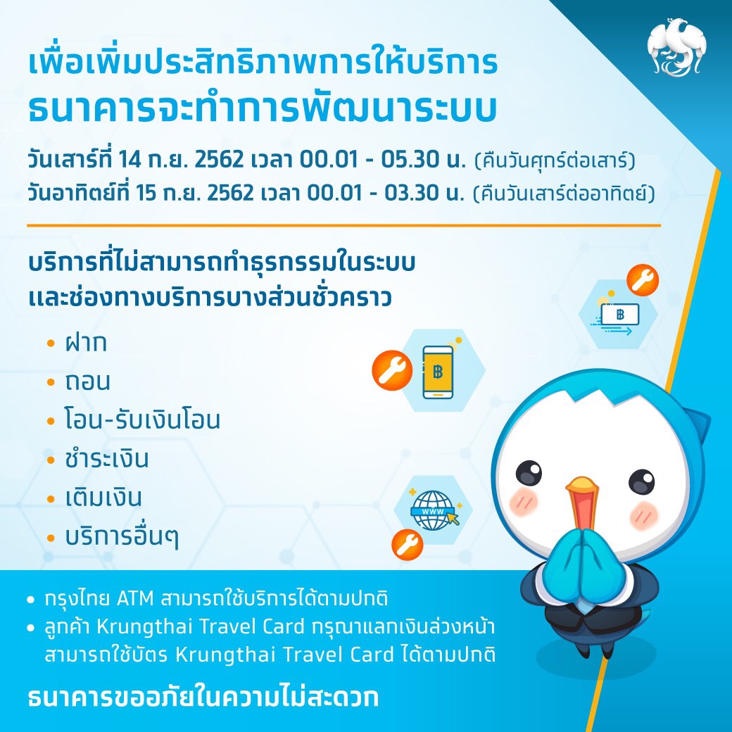 ธนาคารกรุงไทย เพิ่มประสิทธิภาพการให้บริการ ปรับปรุงระบบงานอิเล็กทรอนิกส์ ส่งผลให้ลูกค้าไม่สามารถใช้บริการบางประเภทชั่วคราว ในวันเสาร์ที่ 14 กันยายน 2562 ระหว่างเวลา 00.01 – 05.30 น. ได้แก่ แอปพลิเคชั่นเป๋าตัง กรุงไทย NEXT กรุงไทย Government กรุงไทย Connext กรุงไทย Corporate Online กรุงไทย PromptPay กรุงไทย Verified by VISA กรุงไทย SMS Alert กรุงไทย CO-OP กรุงไทย Fleet Card กรุงไทย Cash Card กรุงไทย SmartFX บริการรับชำระค่าปรับผ่านระบบออนไลน์ บริการจองซื้อหลักทรัพย์ออนไลน์ และกรุงไทย e-Money เฉพาะชำระสินค้าที่ร้านธงฟ้า รวมถึงเว็บไซต์กรุงไทย และเว็บไซต์อื่นๆ ดังนี้กรุงไทย Call Center Internet Banking กรุงไทย Complaint Center ทรัพย์สินพร้อมขาย และสินเชื่อกรุงไทยบ้านแสนสะดวก ทั้งนี้ บริการอื่นๆ สามารถใช้บริการได้ตามปกติ