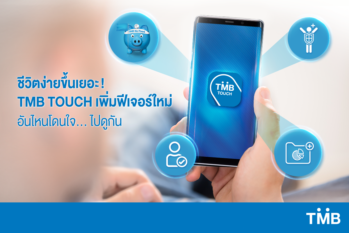 ทีเอ็มบี ทัช เพิ่มฟีเจอร์ครั้งใหญ่ เพื่อยกระดับการให้บริการผ่านช่องทางดิจิทัลรองรับการใช้งานทุกผลิตภัณฑ์ทั้งเงินฝาก ประกันชีวิต และการลงทุน ให้ลูกค้าทีเอ็มบีสามารถเข้าถึงการทำธุรกรรมได้อย่างเบ็ดเสร็จไร้รอยต่อ แบ่งออกเป็น 4 ประเภทใหญ่ ได้แก่ บริการเพื่อการลงทุน บริการเพื่อการประกันชีวิต บริการเพื่อเงินฝากเงินออม และบริการเพื่อตั้งค่าอัตโนมัติต่างๆ อาทิ เพิ่มบริการเปิดพอร์ตการลงทุนทั้งพอร์ตการลงทุนทั่วไปและTMB Smart Port และการซื้อประกันชีวิตแบบสะสมทรัพย์ได้ด้วยตัวเองบนโมบายแบงก์กิ้ง เพิ่มบริการตั้งเป้าหมายการออมเงิน (Savings Goals) สำหรับบัญชีทีเอ็มบี โนฟิกซ์ (TMB NO FIXED) ให้ลูกค้าสามารถตั้งเป้าหมายการออมและจัดการกับบัญชีได้ง่ายๆ ไม่ต้องแบ่งการออมออกเป็นหลายๆบัญชี เพิ่มบริการตั้งค่าการใส่รหัสผ่านเพื่อยืนยันการทำธุรกรรมทางการเงิน การปรับปรุงบริการทีเอ็มบี ไอดี (TMB ID) ในการยืนยันตัวตนผ่าน TMB Contact Center 1558 เพิ่มบริการให้ลูกค้าสามารถออกบัตร TMB  WAVE ผ่านแอปพร้อมรองรับการเปิดใช้งานบัตรได้ทันที สามารถให้ลูกค้าจ่ายบิลค่าไฟค่าน้ำนครหลวงด้วยบัตรเครดิตผ่านแอปได้อย่างสะดวก และในครั้งนี้ยังพัฒนาให้รองรับการใช้งานบน Android 10  และการใช้งานบน Huawei AppGallery นอกจากนี้ยังมีฟังก์ชันอื่นๆ ตอกย้ำความเหนือชั้นของทีเอ็มบี ทัช (TMB TOUCH) โมบายแบงก์กิ้งแอปพลิเคชัน ให้เป็นช่องทางที่สามารถตอบโจทย์การใช้ชีวิตของลูกค้าในยุคดิจิทัลได้อย่างตรงใจที่สุด ครบ จบในแอปพลิเคชันเดียว วันนี้ลูกค้าสามารถอัพเดทเวอร์ชั่นใหม่ได้แล้วที่ App Store, Play Store และ Huawei AppGallery