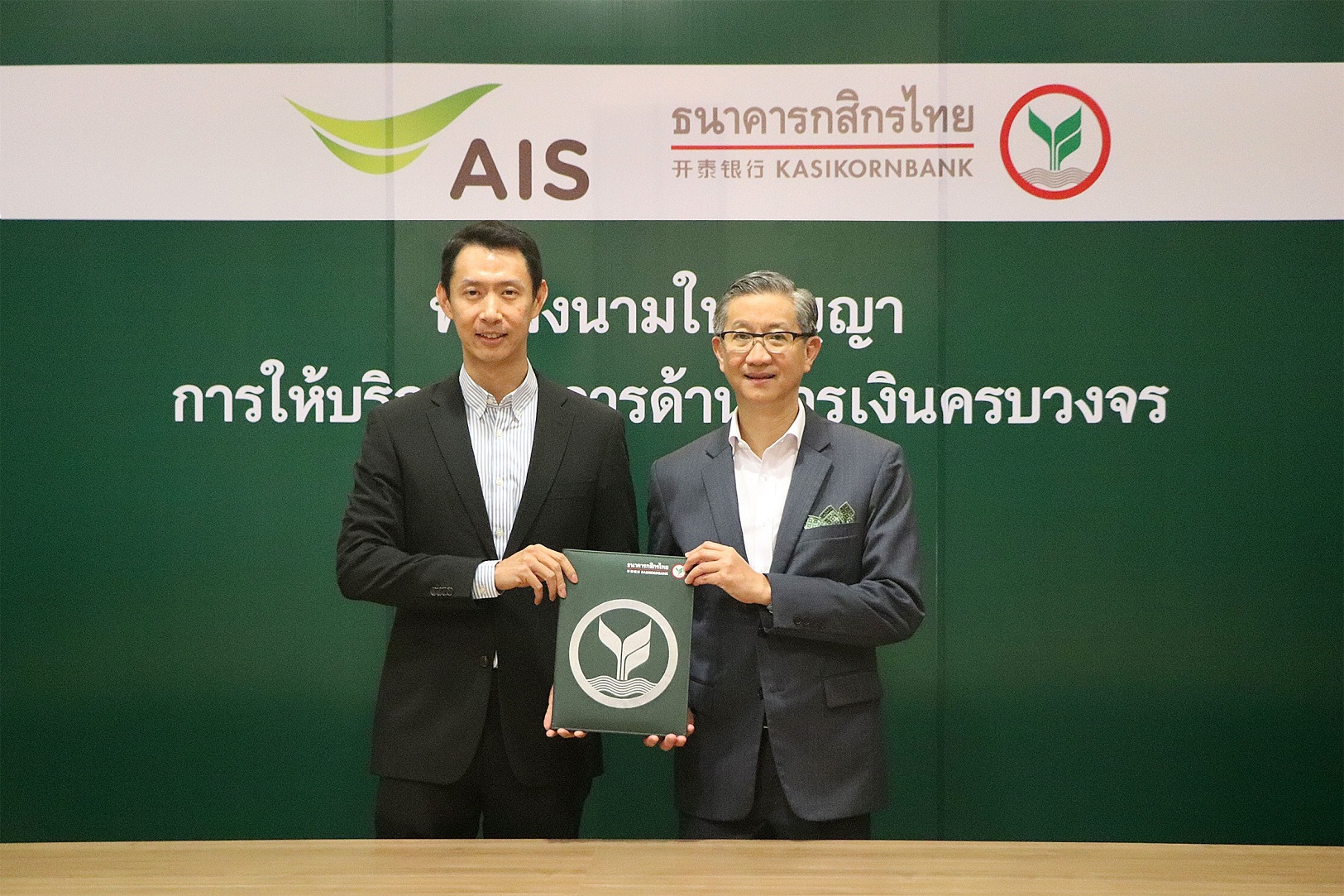 นายศีลวัต สันติวิสัฎฐ์ (ขวา) รองกรรมการผู้จัดการอาวุโส ธนาคารกสิกรไทย และ นายธีร์ สีอัมพรโรจน์ (ซ้าย) หัวหน้าคณะผู้บริหารด้านการเงิน บริษัท แอดวานซ์ อินโฟร์ เซอร์วิส จำกัด (มหาชน) ร่วมลงนามในสัญญาการให้บริการจัดการด้านการเงินแบบครบวงจร Cash Pooling โดยธนาคารจะเข้าไปดูแลบัญชีธนาคารต่าง ๆ ของ เอไอเอส ที่ครอบคลุมถึงการทำธุรกรรมพื้นฐาน ตลอดจนการสั่งจ่ายเช็คและนำฝากเข้าบัญชีของบริษัท เพื่อรวมศูนย์และเพิ่มประสิทธิภาพในการบริหารจัดการเงินอย่างเป็นระบบของเอไอเอส ณ ธนาคารกสิกรไทย อาคารพหลโยธิน เมื่อเร็ว ๆ นี้