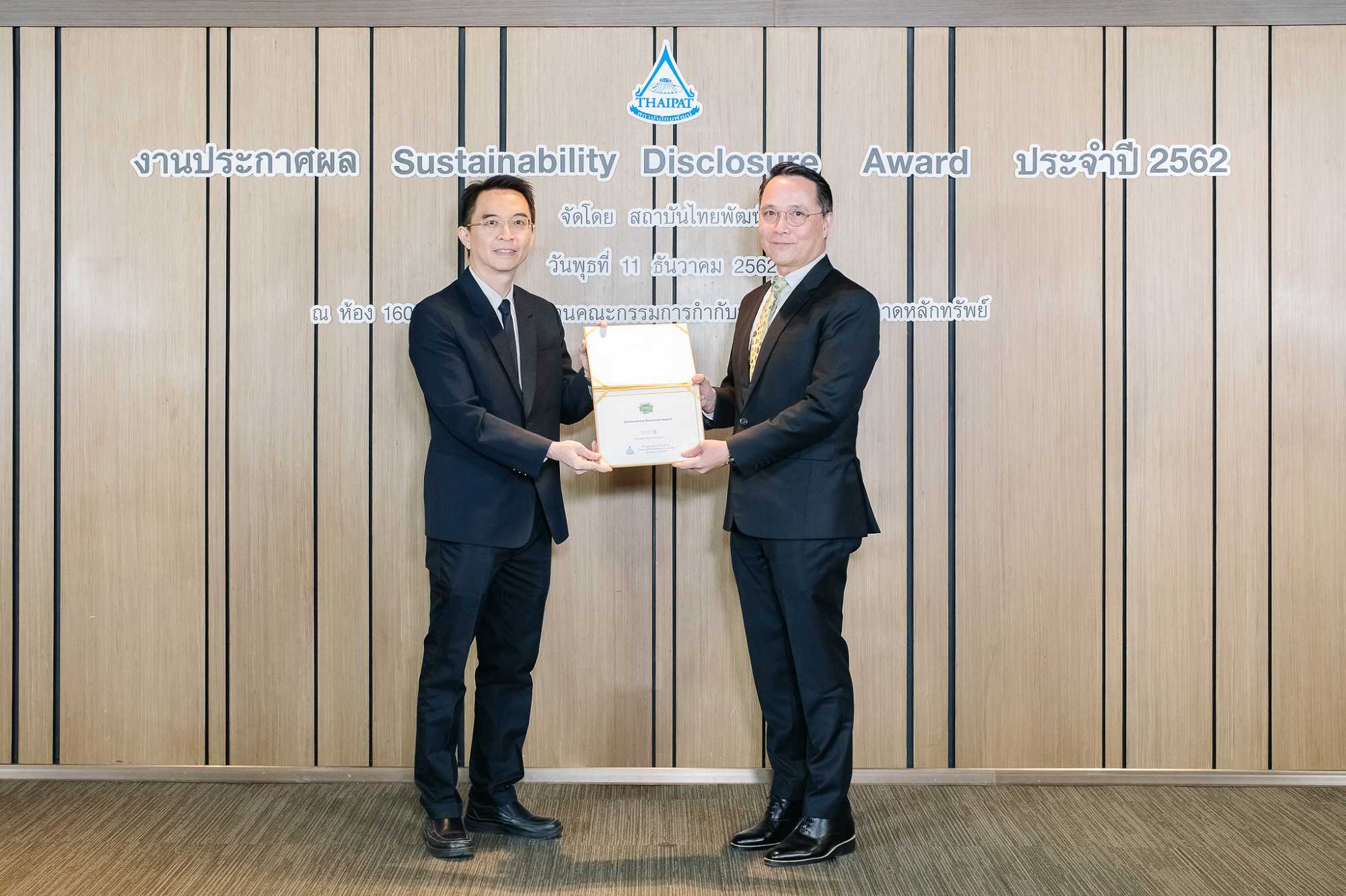 ดร.อดิศวร์ หลายชูไทย (ขวา) รองกรรมการผู้จัดการอาวุโส ธนาคารกสิกรไทย เป็นผู้แทนธนาคารรับรางวัลเกียรติคุณ Sustainability Disclosure Award ซึ่งเป็นรางวัลระดับสูงสุดในงานประกาศผล Sustainability Disclosure Award ประจำปี 2562 จัดขึ้นโดยสถาบันไทยพัฒน์ เพื่อพิจารณามอบให้กับองค์กรสมาชิกเครือข่ายการแลกเปลี่ยนเรียนรู้ Sustainability Disclosure Community ทั้งหมด 104 องค์กร ที่ดำเนินการเปิดเผยข้อมูลความยั่งยืนต่อสาธารณะและผู้มีส่วนได้เสียที่เกี่ยวข้อง ซึ่งจะนำไปสู่การยกระดับการเปิดเผยข้อมูลและการพัฒนาองค์กรแห่งความยั่งยืนในระยะยาว โดยมี ดร.พิพัฒน์ ยอดพฤติการ ประธานสถาบันไทยพัฒน์ เป็นผู้มอบรางวัลฯ ณ สำนักงาน ก.ล.ต. เมื่อเร็ว ๆ นี้