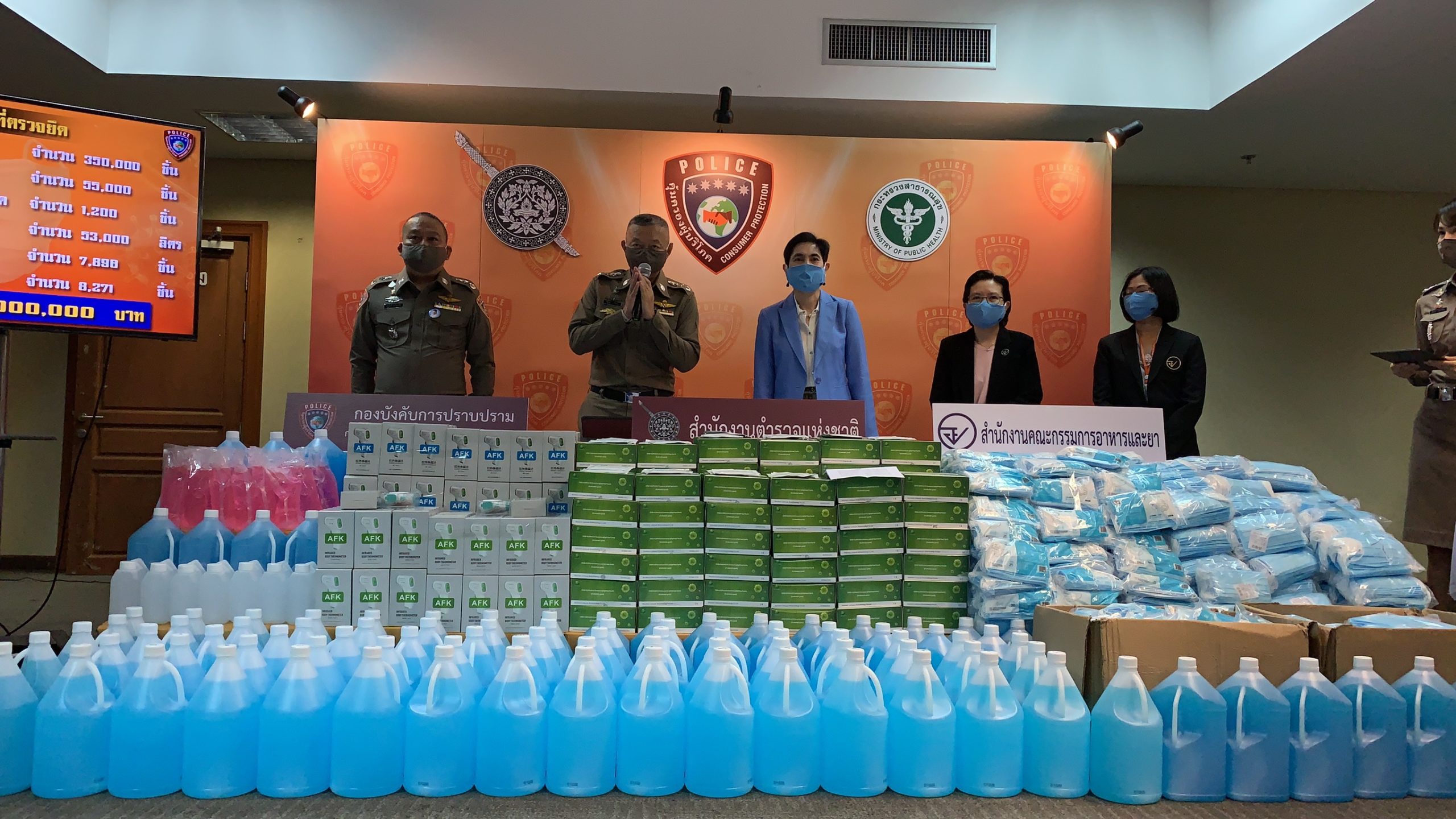 พลตำรวจโท เพิ่มพูน ชิดชอบ ผู้ช่วยผู้บัญชาการตำรวจแห่งชาติ หัวหน้าคณะทำงานปราบปรามผลิตภัณฑ์และการบริการด้านสุขภาพที่ผิดกฎหมายของสำนักงานตำรวจแห่งชาติ พร้อมด้วยพลตำรวจตรีณัฐศักดิ์ เชาวนาศัย ผู้บังคับการปราบปรามการกระทำความผิดเกี่ยวกับการคุ้มครองผู้บริโภค และสำนักงานคณะกรรมการอาหารและยา กระทรวงสาธารณสุข โดย นายแพทย์ไพศาล ดั่นคุ้ม เลขาธิการคณะกรรมการอาหารและยา เภสัชกรหญิงสุภัทรา บุญเสริม รองเลขาธิการคณะกรรมการอาหารและยา ร่วมกันแถลงผลการจับกุมผู้กักตุนหรือขายหน้ากากอนามัยในราคาที่สูงเกินควร รวมถึงลักลอบนำชุดตรวจโควิด-19 และลักลอบผลิตเจลผสมแอลกอฮอล์มาจำหน่ายโดยไม่ได้รับอนุญาตในช่วงวันที่ 22 มีนาคม – 2 เมษายน 2563 พร้อมตรวจยึดของกลางประกอบด้วยหน้ากากอนามัย จำนวน 350,000 ชิ้น อุปกรณ์ชุดตรวจโรคโควิด-19 จำนวน 55,000 ชุด เครื่องวัดอุณหภูมิ แบบอินฟราเรด 1,200 เครื่อง ผลิตภัณฑ์แอลกอฮอล์ 53,000 ลิตร ผลิตภัณฑ์เจลผสมแอลกอฮอล์ 7,896 ชิ้น ผลิตภัณฑ์เครื่องสำอาง 8,271 ชิ้น รวมมูลค่าของกลางที่ตรวจยึดกว่า 50 ล้านบาท