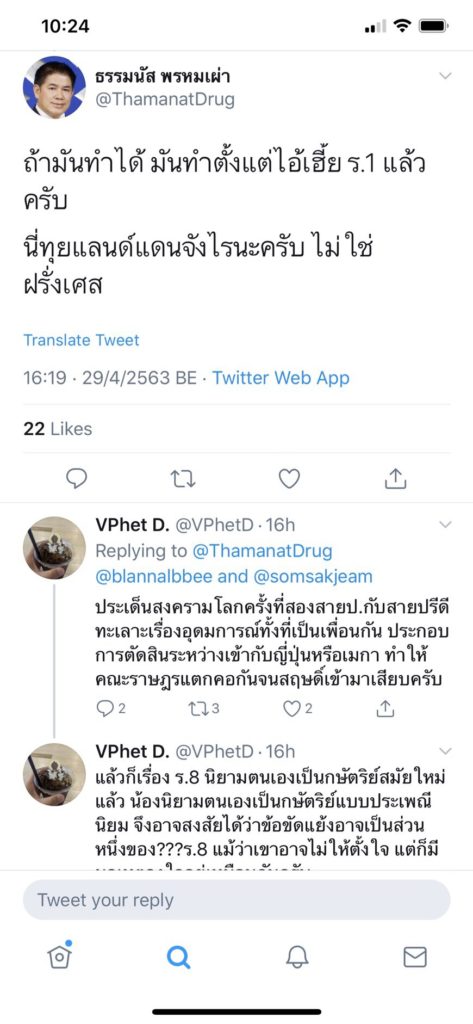 กระทั่งล่าสุดเมื่อวานนี้ วันที่ 29 เม.ย.63 ที่ผ่านมา บัญชีทวิตเตอร์ปลอมดังกล่าวกลับมาเปิดใช้พร้อมโพสต์ข้อความลักษณะหมิ่นเบื้องสูง ทั้งนี้ ร.อ.ธรรมนัส มีบัญชีทวิตเตอร์ส่วนตัวของจริง ชื่อ “Capt.Thamanat” และได้มอบอำนาจตนมาแจ้งความเพิ่มเติมอีกครั้ง กำชับให้สืบสวนหาตัวผู้กระทำผิดโดยเร็ว ซึ่งอาจทำให้ประชาชนเข้าใจผิดและสร้างความเสียหาย