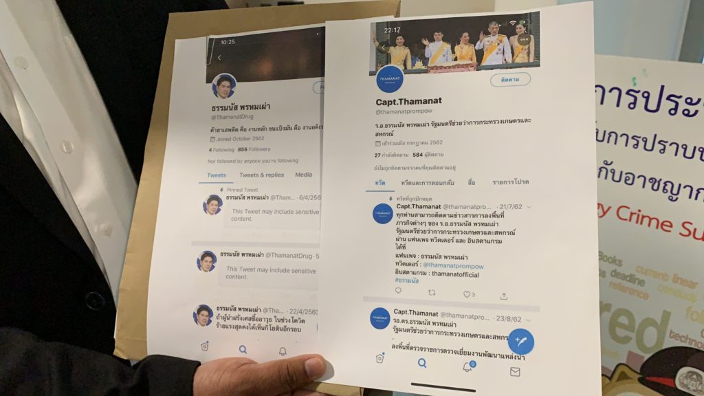 วันที่ 1 พ.ค.63 เวลา 11.00 น.ที่บก.ปอท. : นายอนุรักษ์ วิจิตรพันธ์ ทนายความ ได้รับมอบอำนาจจาก ร.อ.ธรรมนัส พรหมเผ่า รมช.เกษตรและสหกรณ์ นำหลักฐาน เดินทางเข้าแจ้งความต่อ พ.ต.ท.กฤช เสนีย์วงศ์ ณ อยุธยา รอง ผกก.(สอบสวน) กก.3 บก.ปอท. และร.ต.อ.กรฉัตร มาตรศรี รอง สว.(สอบสวน) กก.3 บก.ปอท.เพื่อเอาผิดผู้ที่สร้างบัญชีทวิตเตอร์ปลอมเป็น ร.อ.ธรรมนัสฯ และโพสต์ข้อความไม่เหมาะสมอย่างต่อเนื่อง ซึ่งก่อนหน้านี้เคยมาแจ้งความดำเนินคดีเจ้าของทวิตเตอร์ดังกล่าวแล้วแต่ยังไม่หยุดพฤติกรรม
