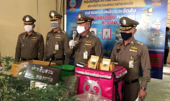 โดยพล.ต.ท.ภัคพงศ์ กล่าวว่า สืบเนื่องจากเจ้าหน้าที่ฝ่ายสืบสวนสน.ทองหล่อ ตรวจสอบข้อมูลทางโซเชียลมีเดีย พบนักท่องเที่ยวที่พักอาศัยในพื้นที่สั่งซื้อกัญชาผ่านระบบออนไลน์พร้อมจัดส่งแบบเดลิเวอรี่ จากกลุ่มแอพพลิเคชั่นไลน์ ใช้ชื่อว่า “Heaven Herb” มีลูกค้าเข้ากลุ่มกว่า 6,000 คน จากการสืบสวนขยายผลทราบว่า มีการส่งกัญชาจากบริเวณร้านคาร์แคร์ ท้ายซอยรามคำแหง 24/3 แขวงหัวหมาก เขตบางกะปิ กรุงเทพฯ เป็นของนายแบงค์ อายุ 27 ปี จึงทำการจับกุม นายแบงค์ ได้พร้อมพวกอีก 8 คน ขณะกำลังแบ่งหน้าที่กันทำงานพูดคุยกับลูกค้าทางไลน์ และบรรจุของเพื่อจัดส่ง พบของกลางกัญชาแห้ง น้ำหนัก 3 กิโลกรัม และเห็ดเมา น้ำหนัก 1 กิโลกรัม
