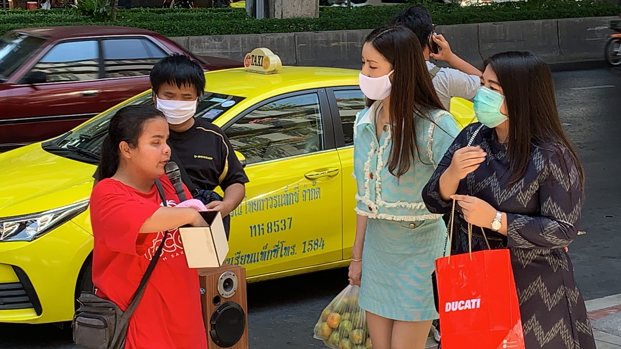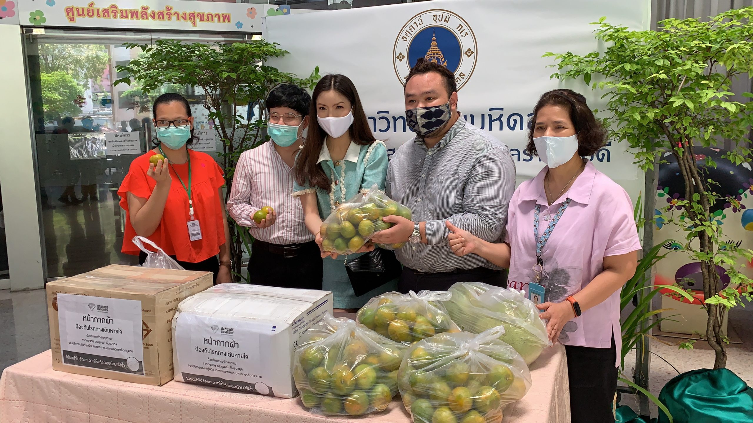 จากนั้น กี้ จริณภรณ์ และเพื่อนๆ ได้นำหน้ากากผ้าและส้ม ไปแจกประชาชนผู้มาใช้บริการด้านนอกโรงพยาบาลรามาธิบดีส่วนหนึ่งด้วย
