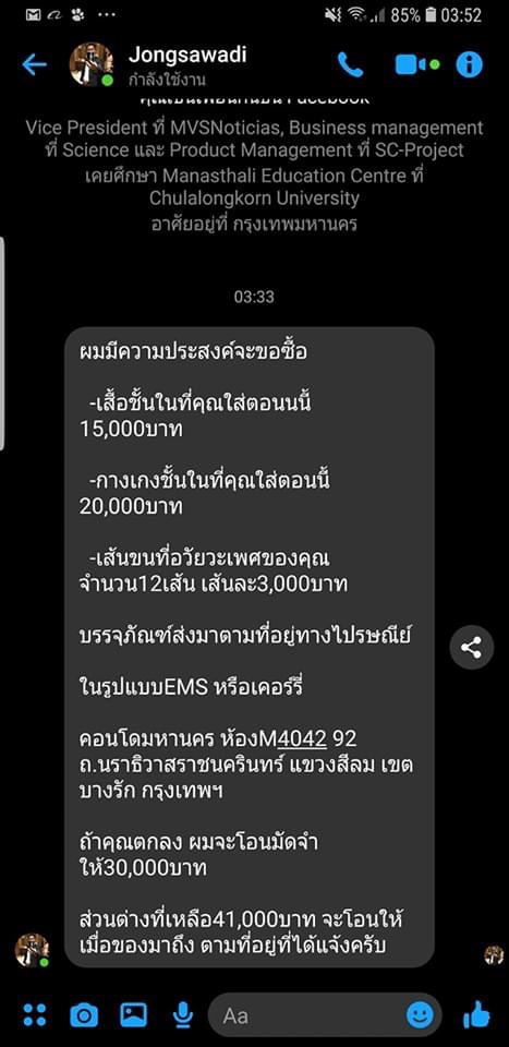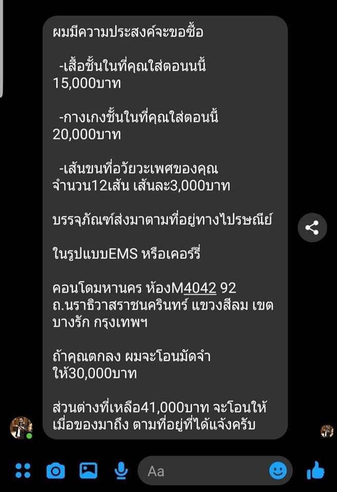 นอกจากนี้มิงค์ ที่เคยติดต่อแจ้งมาก่อนหน้าว่าโดนคนร้ายขอซื้อกางเกงในราคาหลายหมื่นบาท ซึ่งยังไม่รู้ว่าเป็นคนร้ายรายเดียวกันหรือไม่ จะเดินทางมาพบพนักงานสอบสวน กก.3 บก.ปอท.เพื่อให้ช่วยตรวจสอบและสืบสวนหาตัวคนร้ายพร้อมกันทีเดียวเลย ส่วนข้อหาการดระทำผิดของคนร้ายต้องขอดูและพิจารณารายละเอียดที่ผู้เสียหายทั้ง 4 รายจะนำมาให้พนักงานสอบสวนก่อนว่ามีความผิดข้อหาใดบ้าง