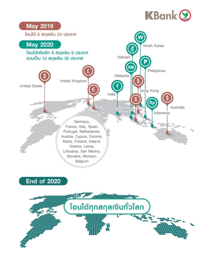 ธนาคารกสิกรไทยผนึกพันธมิตร NIUM ผู้ให้บริการโอนเงินข้ามประเทศชั้นนำจาก สิงคโปร์ พัฒนาเทคโนโลยีการโอนเงินระหว่างประเทศผ่าน Application Programming Interface (API) ขยายสกุลโอนเงินไปต่างประเทศผ่านแอป K PLUS เพิ่มอีก 6 สกุลเงิน เป็น 12 สกุลเงิน ครอบคลุม 30 ประเทศทั่วโลก โดยไม่ต้องใช้เอกสาร ทำรายการได้เองผ่าน K PLUS ตั้งเป้าโอนไปทุกประเทศทั่วโลกภายในสิ้นปี 63