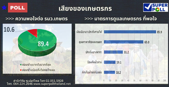 19 – 22 พ.ค. ที่ผ่านมา ต่อมาตรการดูแลเกษตรกร ในยุคของนายเฉลิมชัย ศรีอ่อน รัฐมนตรีว่าการกระทรวงเกษตรและสหกรณ์ พบว่า ร้อยละ 85.9 พอใจเงินเยียวยาเกษตรกร ประกันราคาสินค้าเกษตร ประกันรายได้, ร้อยละ 65.0 พอใจการดูแลพัฒนาราคาพืชผลทางการเกษตร, ร้อยละ 31.2 พอใจประกันยางพารา, ร้อยละ 19.1 พอใจโครงการป้องกันน้ำท่วม และร้อยละ 18.2 พอใจกักเก็บน้ำแก้ภัยแล้ง ตามลำดับ อีกทั้ง ร้อยละ 89.4 ค่อนข้างพอใจถึงพอใจมากที่สุดต่อมาตรการแก้ปัญหาเกษตรกรในภาพรวม