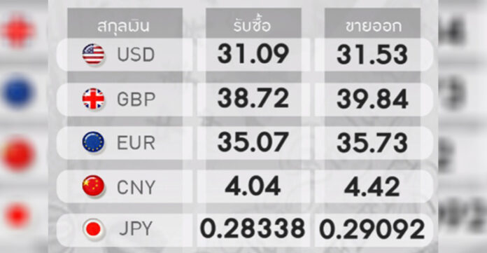 อัตราแลกเปลี่ยนเงินตราต่างประเทศของธนาคารกสิกรไทย ประจำวันศุกร์ที่ 5 มิถุนายน 2563 เมื่อเวลา 08.02 น. มีดังนี้ ดอลลาร์สหรัฐ รับซื้อ 31.09 บาท ขายออก 31.53 บาท ยูโรอยู่ที่ระดับ 35.73 บาทต่อยูโร ปอนด์อยู่ที่ 39.84 บาทต่อปอนด์ เงินหยวนของจีนอยู่ที่ 4.42 บาทต่อหยวน และเงินเยนของญี่ปุ่นอยู่ที่ 0.29092 บาทต่อเยน