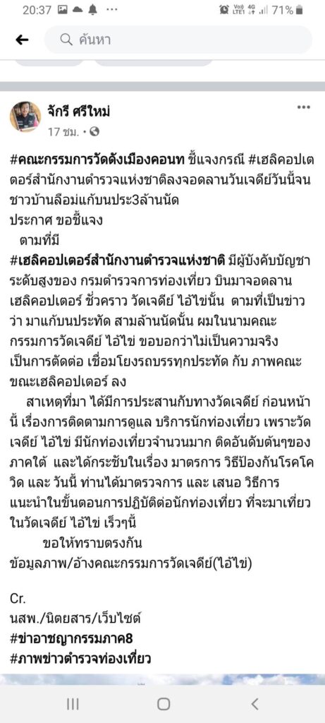 ในขณะเดียวกันมีรายงานว่า มีผู้ใช้เฟสบุคส ชื่อ ”จักกรี ศรีใหม่” ซึ่งเป็นหนึ่งในกรรมการวัดเจดีย์ไอ้ไข่วัดดังได้โพสน์ข้อความชี้แจงข้อความว่า : กรณี #เฮลิคอปเตอร์สำนักงานตำรวจแห่งชาติลงจอดลานวันเจดีย์วันนี้ จนชาวบ้านลือมแก้บนประมาณ 3 ล้านนัดนั้นขอประกาศ ชี้แจงว่า : ตามที่เฮลิคอปเตอร์สำนักงานตำรวจแห่งชาติมีผู้บังคับบัญชาระดับสูงของ กรมตำรวจการท่องเที่ยว บินมาจอดลานเฮลิคอปเตอร์ ชั่วคราว วัดเจดีย์ ไอ้ไข่นั้น ตามที่เป็นข่าวว่า มาแก้บนประทัด สามล้านนัดนั้น ผมในนามคณะกรรมการวัดเจดีย์ ไอ้ไข่ ขอบอกว่าไม่เป็นความจริงเป็นการตัดต่อ เชื่อมโยงรถบรรทุกประทัด กับภาพคณะขณะเฮลิคอปเตอร์ลง สาเหตุที่มาได้มีการประสานกับทางวัดเจดีย์ ก่อนหน้านี้ เรื่องการติดตามการดูแล บริการนักท่องเที่ยว เพราะวัดเจดีย์ ไอ้ไข่ มีนักท่องเที่ยวจำนวนมาก ติดอันดับต้นๆของภาคใต้ และได้กระชับในเรื่อง มาตรการ วิธีป้องกันโรคโควิด-19 และ วันนี้ ท่านได้มาตรวจการ และ เสนอ วิธีการแนะนำในขั้นตอนการปฏิบัติต่อนักท่องเที่ยว ที่จะมาเที่ยวในวัดเจดีย์ ไอ้ไข่ เร็วๆนี้ขอให้ทราบตรงกัน “จากคณะกรรมการวัดเจดีย์”