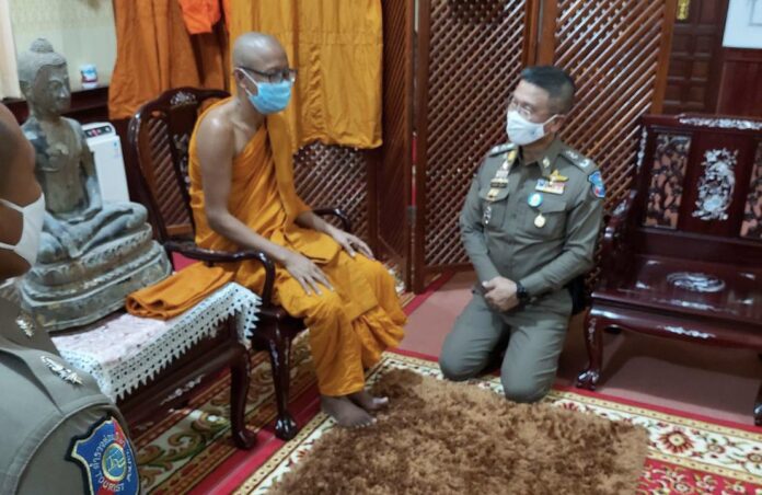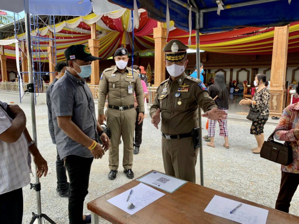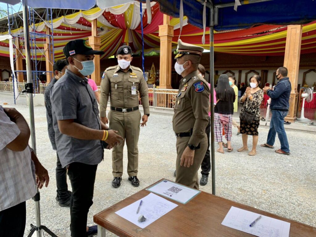 ในเวลาต่อมา หลังจากเสร็จภาระกิจที่ รร.วัดสโสมร อ.ท่าศาลา พร้อมทั้งเดินทางไปเยี่ยมและมอบเงินให้ผู้ป่วยติดเตียง เมื่อเยี่ยมผู้ป่วยติดเตียงแล้ว จึงเดินทางไป วัดเจดีย์ เพื่อเข้าพบท่านเจ้าอาวาส เนื่องจากที่วัดนี้มีนักท่องเที่ยวทั้งชาวไทยและต่างชาติ มาที่วัดเป็นจำนวนมาก จึงมาเพื่อขอทราบการวางมาตรการการป้องกันการแพร่ระบาดโควิด-19 ที่คณะทำงานวัดกำหนดไว้
