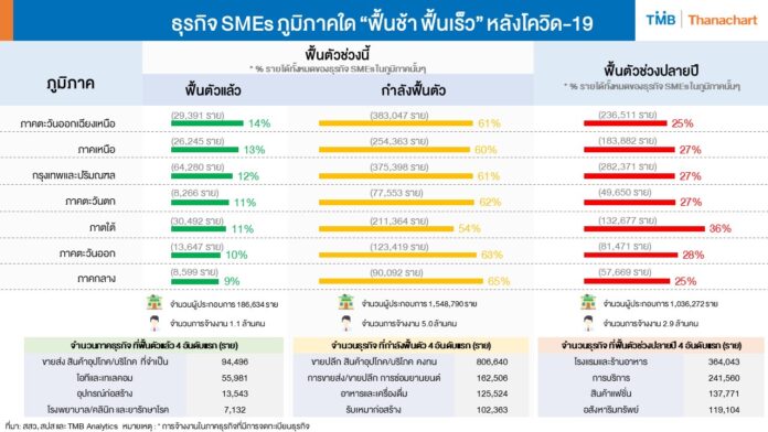 การแพร่ระบาดของโควิด-19 ได้ส่งผลกระทบในวงกว้างต่อการดำเนินธุรกิจ ทำให้ผู้บริโภคชะลอการจับจ่ายใช้สอย อย่างไรก็ตามสถานการณ์การแพร่ระบาดในไทยเริ่มดีขึ้นมาก ภาครัฐได้ทยอยปลดล็อกดาวน์เพื่อให้ภาคธุรกิจสามารถกลับมาดำเนินกิจการได้อีกครั้ง ส่งผลบวกต่อผู้ประกอบการธุรกิจ SMEs ซึ่งจะได้อานิสงค์จากกำลังซื้อในประเทศที่ฟื้นกลับมามากที่สุด ศูนย์วิเคราะห์เศรษฐกิจ ทีเอ็มบี ทำการประเมินแนวโน้มลักษณะการฟื้นตัวของธุรกิจ SMEs ในแต่ละภูมิภาค ภายหลังการทยอยผ่อนคลายล็อกดาวน์ โดยพิจารณานโยบายปลดล็อกประเทศทั้งในประเทศและตลาดส่งออกของแต่ละธุรกิจความจำเป็นของลักษณะสินค้าต่อการดำรงชีวิตประจำวันของผู้บริโภคและปัจจัยเสี่ยงด้านโครงสร้างธุรกิจที่มีอยู่เดิมที่มีแนวโน้มจะได้รับผลกระทบอย่างหนักแม้ปลดล็อกดาวน์ไปแล้ว โดยประเมินการฟื้นตัวของธุรกิจ SMEs