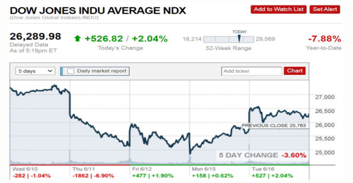 ดาวโจนส์ ปิดที่ 26,289.98 จุด เพิ่มขึ้น 526.82 จุด หรือ 2.04%
