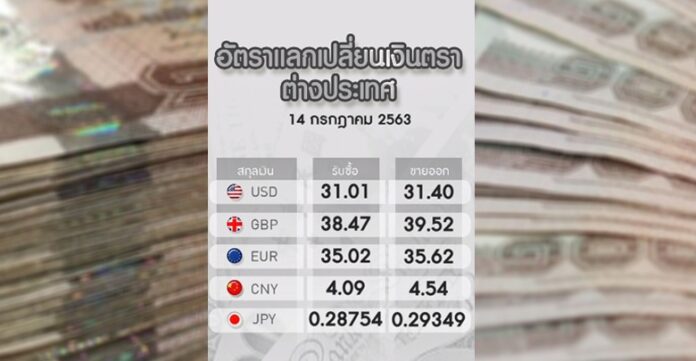 อัตราแลกเปลี่ยนเงินตราต่างประเทศของธนาคารกสิกรไทย ประจำวันอังคารที่ 14 กรกฎาคม 2563 เมื่อเวลา 08.16 น. มีดังนี้