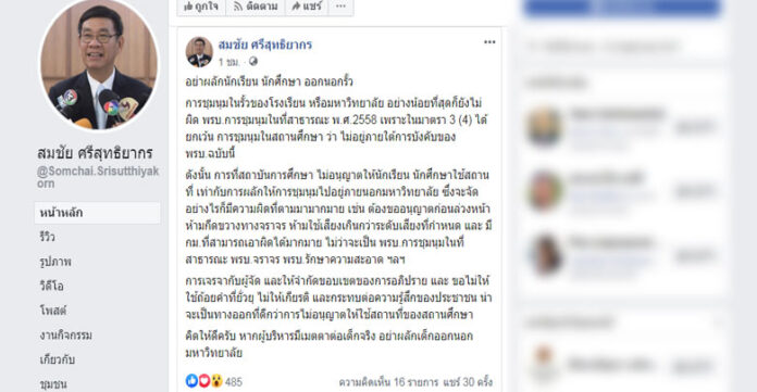 นายสมชัย ศรีสุทธิยากร อดีตกรรมการการเลือกตั้ง รองประธานกมธ.วิสามัญพิจารณาศึกษาปัญหาหลักเกณฑ์ และแนวทางการแก้ไขเพิ่มเติมรัฐธรรมนูญ พ.ศ.2560 ระบุข้อความผ่านเฟซบุ๊กส่วนตัว “สมชัย ศรีสุทธิยากร” ถึง กรณี สำนักบริหารกิจการนิสิตจุฬาลงกรณ์มหาวิทยาลัย ประกาศผ่านเฟซบุ๊กแฟนเพจ เมื่อวันที่ 14 สิงหาคมไม่อนุมัติให้กลุ่มคณะจุฬาฯและสปริงมูฟเมนต์ ให้จัดกิจกรรมเนื่องจากยื่นหนังสือกระชั้นชิด หวั่นเกรงความปลอดภัย ก่อนที่กลุ่มผู้จัดกิจกรรมจะประกาศเดินหน้าจัดชุมนุมในเย็นวันเดียวกันนี้ต่อไปนั้น ว่า อย่าผลักนักเรียน นักศึกษา ออกนอกรั้ว การชุมนุมในรั้วของโรงเรียน หรือมหาวิทยาลัย อย่างน้อยที่สุดก็ยังไม่ผิด พรบ.การชุมนุมในที่สาธารณะ พ.ศ.2558 เพราะในมาตรา 3 (4) ได้ยกเว้น การชุมนุมในสถานศึกษา ว่า ไม่อยู่ภายใต้การบังคับของพรบ.ฉบับนี้
