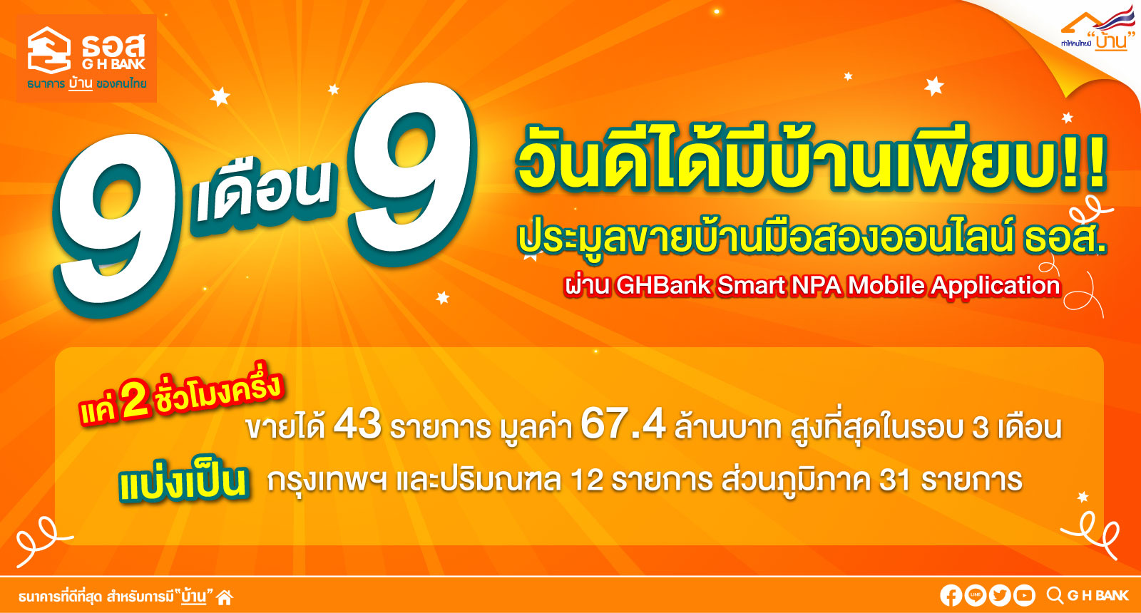 ธอส. เผยผลการจัดงาน“9 เดือน 9” ประมูลบ้านมือสองออนไลน์ธนาคารอาคารสงเคราะห์ผ่าน Application : G H Bank Smart NPA ในวันนี้(9 กันยายน 2563) หลังเปิดประมูลระหว่างเวลา11.00-13.30 น. จำหน่ายทรัพย์ได้ทั้งสิ้น 43 รายการคิดเป็นมูลค่ารวม 67.4 ล้านบาทสูงที่สุดในรอบ 3 เดือนแบ่งเป็นทรัพย์ที่ตั้งอยู่ในพื้นที่กรุงเทพฯและปริมณฑล 12 รายการทรัพย์ในส่วนภูมิภาค 31 รายการพิเศษ!! ธอส. มอบส่วนลดเพิ่มอีก 10%จากราคาที่ปิดประมูลให้แก่ผู้ชนะการประมูลเพียงทำสัญญาและทำนิติกรรมให้แล้วเสร็จภายในวันที่ 30 ธันวาคม 2563 เพื่อช่วยลดภาระค่าใช้จ่ายให้ประชาชน