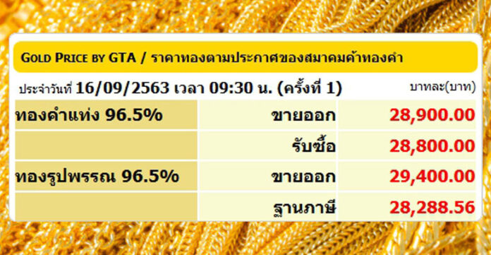 โดยทองรูปพรรณ รับซื้อบาทละ 28,288.56 บาท ขายออกบาทละ 29,400.00 บาท