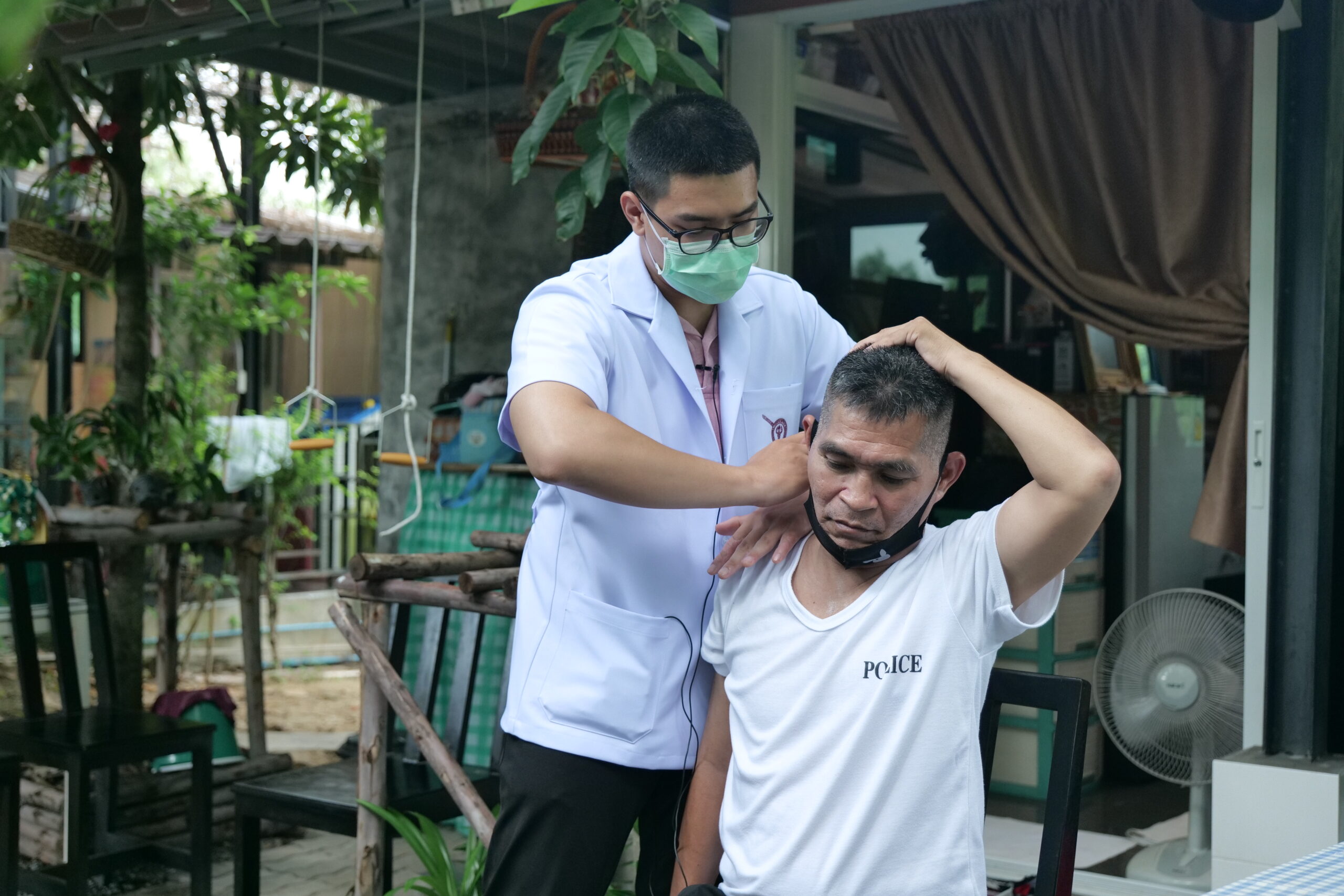 วันอังคารที่ 22 กันยายน พล.ต.ต.ธนิต จิรนันท์ธวัช นายแพทย์ (สบ 6) โรงพยาบาลตำรวจ/ประธานคณะทำงานโครงการ “Inlove Online” และ “Inlove @Home” พร้อมทีมพยาบาล หน่วยตรวจเยี่ยมบ้าน ลงพื้นที่เยี่ยมบ้านผู้ป่วย เพื่อตรวจร่างกายอย่างละเอียด แนะนำการทำกายภาพบำบัดอย่างถูกวิธี ฉีดวัคซีนป้องกันไข้หวัดใหญ่ พร้อมมอบกระเช้าเครื่องดื่มเป็นขวัญกำลังใจให้กับผู้ป่วยและครอบครัว อีกทั้งนำประวัติการตรวจรักษาที่โรงพยาบาลตำรวจมอบให้ผู้ป่วยตามคำร้องขอผ่านเพจเฟสบุ๊ก โครงการ “Inlove @Home” เพื่ออำนวยความสะดวกให้ผู้ป่วยในยุคโควิด-19 นำไปรักษาตัวที่โรงพยาบาลใกล้บ้าน ไม่ต้องเดินทางมารักษาตัวที่โรงพยาบาลตำรวจ