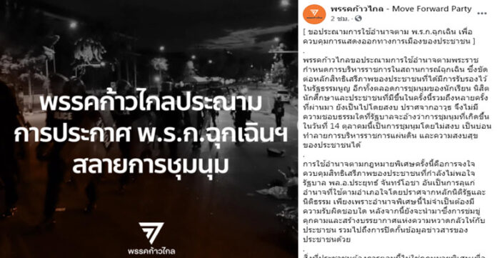 พรรคก้าวไกลออกแถลงการณ์ขอประณามการใช้อำนาจตามพระราชกำหนดการบริหารราชการในสถานการณ์ฉุกเฉิน ซึ่งขัดต่อหลักสิทธิเสรีภาพของประชาชนที่ได้มีการรับรองไว้ใน รัฐธรรมนูญ อีกทั้งตลอดการชุมนุมของนักเรียน นิสิต นักศึกษาและประชาชนที่มีขึ้นในครั้งนี้รวมถึงหลายครั้งที่ผ่านมา ยังเป็นไปโดยสงบ ปราศจากอาวุธ จึงไม่มีความชอบธรรมใดที่รัฐบาลจะอ้างว่าการชุมนุมที่เกิดขึ้นในวันที่ 14 ตุลาคมนี้เป็นการชุมนุมโดยไม่สงบ เป็นบ่อนทำลายการบริหารราชการแผ่นดิน และความสงบสุขของประชาชนได้