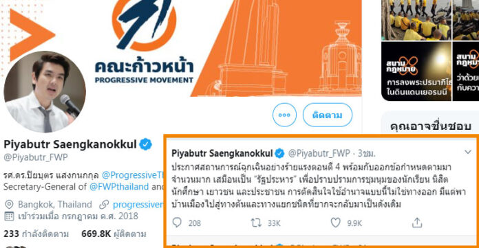 นายปิยบุตร แสงกนกกุล อดีตเลขาธิการพรรคอนาคตใหม่ โพสต์ข้อความ ผ่านทวิตเตอร์ส่วนตัว โดยระบุว่า ประกาศสถานการณ์ฉุกเฉินอย่างร้ายแรงตอนตี 4 พร้อมกับออกข้อกำหนดตามมาจำนวนมาก เสมือนเป็นรัฐประหาร เพื่อปราบปรามการชุมนุมของนักเรียน นิสิต นักศึกษา เยาวชน และประชาชน การตัดสินใจใช้อำนาจแบบนี้ไม่ใช่ทางออก มีแต่พาบ้านเมืองไปสู่ทางตันและทางแยกชนิดที่ยากจะกลับมาเป็นดังเดิม