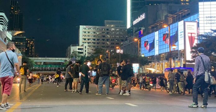 บรรยากาศการชุมนุมของกลุ่มคณะราษฎร 63 ที่บริเวณข้ามคลองแสนแสบ แยกประตูน้ำ ล่าสุดกลุ่มมวลชนปักหลักร่วมกิจกรรม พร้อมเรียกร้องให้มีการปล่อยตัวแกนนำและชูสัญลักษณ์ 3 นิ้ว ขณะที่บางส่วนได้เริ่มทยอยออกจากพื้นที่