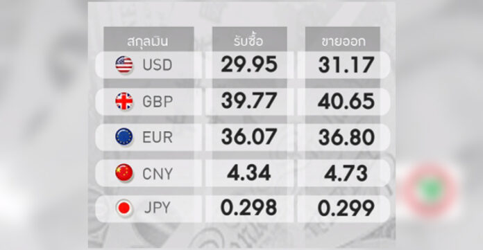 ดอลลาร์สหรัฐ รับซื้อ 29.95 บาท ขายออก 31.17 บาท