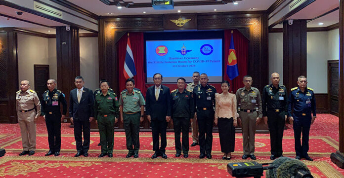 พล.อ.ประยุทธ์ จันทร์โอชา นายกรัฐมนตรีและรัฐมนตรีว่าการกระทรวงกลาโหม เป็นประธานในพิธีส่งมอบห้องแยกผู้ป่วยเคลื่อนที่ (ตู้ความดันลบ) แก่ผู้ช่วยทูตทหารอาเซียน ประจำประเทศไทย ณ ห้องภาณุรังษี ในศาลาว่าการกลาโหม โดยมี ผู้ช่วยทูตทหารประเทศสมาชิกอาเซียน ประจำประเทศไทย ผู้บัญชาการกองทัพไทย ผู้บัญชาการเหล่าทัพ เข้าร่วมในพิธี ตามมติคณะรัฐมนตรี เมื่อวันที่ ๑๕ กันยายน ๒๕๖๓ ที่ได้เห็นชอบให้กระทรวงกลาโหม สนับสนุนงบประมาณของสำนักงานปลัดกระทรวงกลาโหม ให้แก่ศูรย์แพทย์ทหารอาเซียน (ASEAN Center of Military Medicine : ACMM) สำหรับโครงการพัฒนาความร่วมมือด้านการแพทย์ทหารกับประเทศเพื่อนบ้าน ในการจัดทำตู้ความดันลบกรณีติดเชื้อโรคไวรัสโคโรนา 2019 (Mobile Isolation Room for COVID-19 Patient) ผ่านโครงการ Project-Based Programme เพื่อแจกจ่ายและถ่ายทอดองค์ความรู้ให้แก่ประเทศสมาชิกอาเซียนที่มีความสนใจ ตลอดจนเป็นการเสริมสร้างความร่วมมือทางการแพทย์ของกองทัพประเทศสมาชิกอาเซียน ซึ่งในขั้นต้นสามารถให้การสสนับสนุนประเทศสมาชิกอาเซียนได้จำนวน 4 ประเทศ ได้แก่ ราชอาณาจักรกัมพูชา สาธารณรัฐประชาธิปไตยประชาชนลาว มาเลเซีย และสาธารณรัฐแห่งสหภาพเมียนมาการส่งมอบห้องแยกผู้ป่วยเคลื่อนที่ (ตู้ความดันลบ) นับเป็นการส่งเสริมบทบาทและภาพลักษณ์ของกระทรวงกลาโหม เพื่อขับเคลื่อนความร่วมมือด้านความมั่นคงของภูมิภาคในการตอบสนองต่อภัยคุกคาม ด้านความมั่นคงรูปแบบใหม่ รวมทั้งสนับสนุนความร่วมมือด้านการแพทย์ระหว่างประเทศสมาชิกอาเซียนผ่านกลไกความร่วมมือของผ่านกลไกความร่วมมือของศูนย์แพทย์ทหารอาเซียนที่ริเริ่มจัดตั้งขึ้นโดยกระทรวงกลาโหม ในการร่วมกันแก้ปัญหาการแพร่ระบาดของ COVID-19 ของภูมิภาคอย่างเป็นรูปธรรม ตลอดจนเสริมสร้างความร่วมมือทางทหารที่แน่นแฟ้นระหว่างประเทศสมาชิกอาเซียน