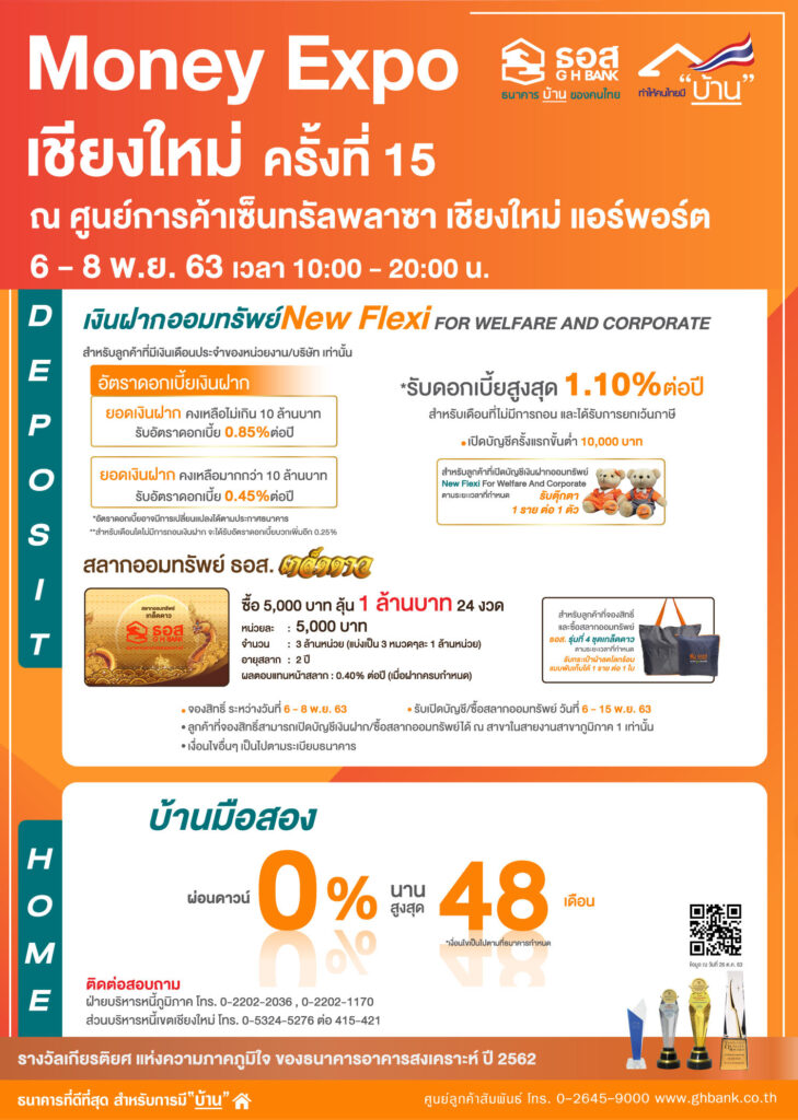 ธนาคารอาคารสงเคราะห์ ธนาคารบ้านของคนไทย จัดโปรโมชั่นพิเศษสำหรับชาวเหนือที่ต้องการมีบ้าน ด้วยสินเชื่อดอกเบี้ย 2 ปีแรก คงที่ 2.99% ต่อปี ปีที่ 3 MRR ลบ 3.16% ต่อปี ปัจจุบันเฉลี่ย 3 ปีแรกอัตราดอกเบี้ยเพียง 2.99% ต่อปี และจัดช่วงนาทีทอง Golden Minute ในวันอาทิตย์ที่ 8 พฤศจิกายน 2563 พบกับอัตราดอกเบี้ยพิเศษยิ่งกว่าเดิม เพียงจองสิทธิ์ผ่าน Application : GHB ALL เวลา 15.00 – 15.15 น. เท่านั้น วงเงินจำกัด จองก่อนได้ก่อน!! ด้านคนรักการออมพบกับสลากออมทรัพย์ ธอส. ชุดเกล็ดดาว หน่วยละ 5,000 บาท ได้ลุ้นรางวัลสูงสุด 1 ล้านบาท ตลอด 24 เดือน และเงินฝากออมทรัพย์ New Flexi For Welfare and Corporate รับอัตราดอกเบี้ยสูงสุด 1.10% ต่อปี พร้อมด้วยทรัพย์ NPA ลดราคาพิเศษสูงสุด 60% ที่งาน Money Expo เชียงใหม่ ครั้งที่ 15 วันที่ 6 – 8 พฤศจิกายน 2563 ณ ศูนย์การค้าเซ็นทรัลพลาซา เชียงใหม่