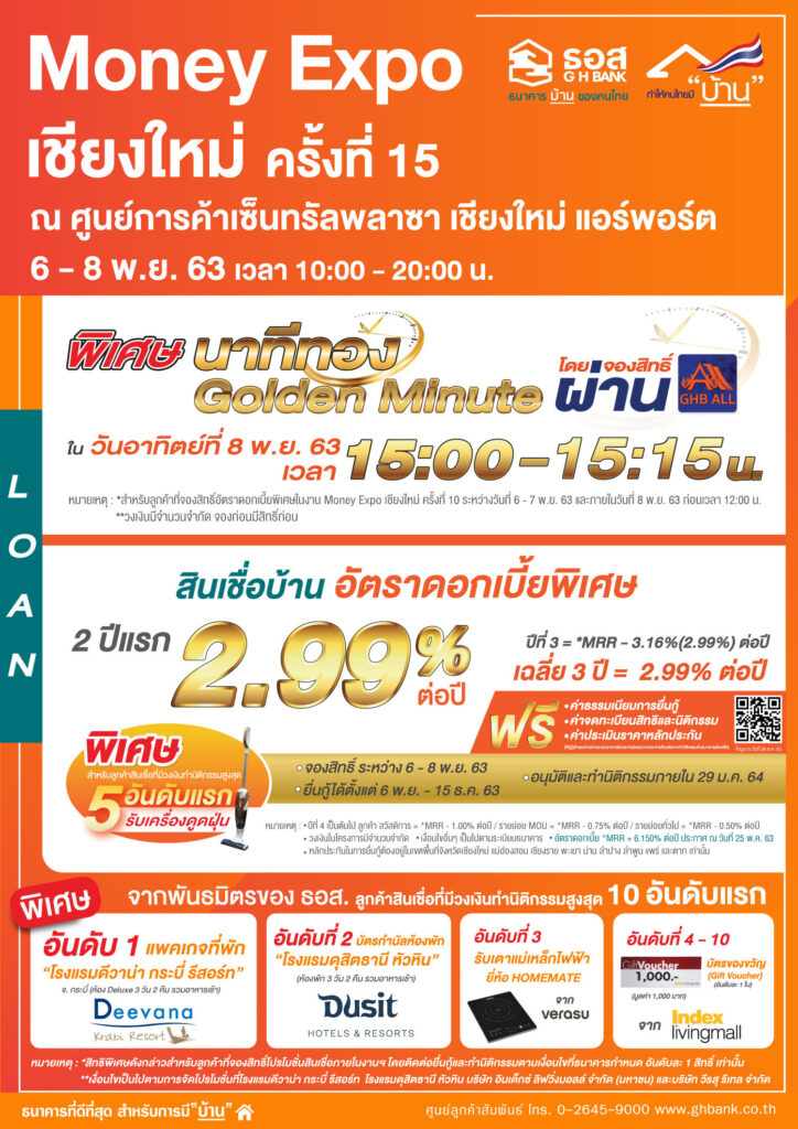 โดยต้องจองสิทธิ์สินเชื่อภายในงาน ยื่นคำขอกู้ระหว่างวันที่ 6 พฤศจิกายน – 15 ธันวาคม 2563 อนุมัติและทำนิติกรรมภายในวันที่ 29 มกราคม 2564 และพลาดไม่ได้สำหรับสินเชื่อบ้านอัตราดอกเบี้ยพิเศษที่สุดในงานช่วงนาทีทอง Golden Minute ซึ่งธนาคารจะเปิดให้เฉพาะลูกค้าที่จองสิทธิ์สินเชื่อบ้านอัตราดอกเบี้ยพิเศษในงาน Money Expo เชียงใหม่เรียบร้อยแล้วภายในวันที่ 8 พฤศจิกายน 2563 ก่อนเวลา 12.00 น. จากนั้นจะสามารถจองสิทธิ์สินเชื่อช่วงนาทีทอง Golden Minute ได้ผ่าน Application : GHB ALL ในวันอาทิตย์ที่ 8 พฤศจิกายน 2563 ตั้งแต่เวลา 15.00 – 15.15 น. จองก่อนได้ก่อน (ธนาคารขอสงวนสิทธิ์ในการปิดจองก่อนเวลา 15.15 น. เมื่อมีการจองเต็มกรอบวงเงินรวม 100 ล้านบาท และห้ามกู้เกินวงเงินที่จองสิทธิ์) ทั้งนี้ ลูกค้าสินเชื่อที่มีวงเงินทำนิติกรรมสูงสุด 5 อันดับแรก ยังมีสิทธิ์ได้รับของสมนาคุณพิเศษจากธนาคารอีกด้วย