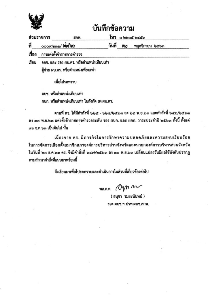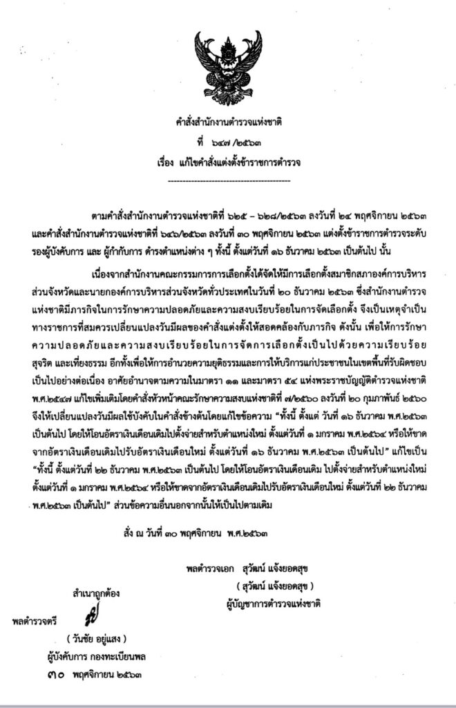 ใจความสำคัญให้แก้ไขคำสั่งตร.ที่ 625-628/2563 และคำสั่งตร.ที่ 646/2563 ที่เผยแพร่ไปแล้วก่อนหน้านี้ รวม 2,209 ตำแหน่ง โดยเปลี่ยนแปลงวัน คำสั่งมีผล จาก 16 ธ.ค. 2563 เนื่องจากในวันที่ 20 ธ.ค. 2563 เป็นการเลือกตั้งสมาชิกองค์การบริหารส่วนจังหวัด และนายกองค์การบริหารส่วนจังหวัด ทั่วประเทศ เพื่อให้การรักษาความสงบเรียบร้อยและความปลอดภัยการเลือกตั้งท้องถิ่นทั่วประเทศ จึงเลื่อนกำหนดให้คำสั่งแต่มีผลในวันที่ 22 ธ.ค.2563 แทน