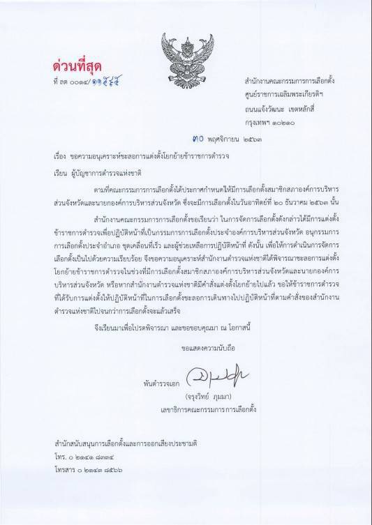 อนึ่ง เมื่อวันที่ 30 พ.ย.ที่ผ่านมา พ.ต.อ.จรุงวิทย์ ภุมมา เลขาธิการ สำนักงานคณะกรรมการการเลือกตั้ง(กกต.) มีหนังสือถึง พล.ต.อ.สุวัฒน์ แจ้งยอดสุข ผบ.ตร. ระบุว่าตามที่ กกต.กำหนดให้มีการเลือกตั้งสมาชิกสภาองค์การบริหารส่วนจังหวัด(อบจ.) และนายก อบจ. ซึ่งจะมีการเลือกตั้งในวันที่ 20 ธ.ค.2563 นั้น สำนักงาน กกต.ขอเรียน ว่า ในการจัดการเลือกตั้งดังกล่าวได้มีการแต่งตั้งข้าราชการตำรวจเพื่อปฏิบัติหน้าที่เป็นกรรมการการเลือกตั้งประจำองค์การบริหารส่วนจังหวัด อนุกรรมการการเลือกตั้งประจำอำเภอ ชุดเคลื่อนที่เร็ว และผู้ช่วยเหลือการปฏิบัติหน้าที่ ดังนั้น เพื่อให้การดำเนินการจัดการเลือกตั้งเป็นไปด้วยความเรียบร้อย จึงขอความอนุเคราะห์สำนักงานตำรวจแห่งชาติได้พิจารณาชะลอการแต่งตั้งโยกย้ายข้าราชการตำรวจในช่วงที่มีการเลือกตั้งสมาชิกสภา อบจ.และนายกอบจ.หรือ หากมีคำสั่งแต่งตั้งโยกย้ายไปแล้ว ขอให้ข้าราชการตำรวจที่ได้รับการแต่งตั้งไปปฏิบัติหน้าที่ในการเลือกตั้ง ชลอการเดินทางไปปฏิบัติหน้าที่ตามคำสั่งของสำนักงานตำรวจแห่งชาติไปจนกว่าการเลือกตั้งจะแล้วเสร็จ