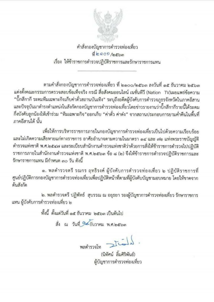 เมื่อวันที่ 16 ธันวาคม พล.ต.ท.นิทัศน์ ลิ้มศิริพันธ์ ผู้บัญชาการตำรวจท่องเที่ยว (ผบช.ทท.) ได้มีคำสั่งที่ 2101/2563 เรื่องให้ข้าราชการตำรวจปฏิบัติราชการแทนและรัการาชการแทน ใจความว่า ตามคำสั่งกองบัญชาการตำรวจท่องเที่ยว ที่ 2100/2563 ลงวันที่ 15 ธันวาคม 2563 แต่งตั้งคณะกรรมการตรวจสอบข้อเท็จจริง กรณีสื่อสังคมออนไลน์ เผยแพร่ข้อความ “บิ๊กสีกากี ระดมทีมเฉพาะกิจเก็บค่าตั๋วสถานบันเทิง” ระบุถึงอดีตผู้บังคับการตำรวจภูธรจังหวัดในภาคอีสานและปัจจุบันมาดำรงตำแหน่งในสังกัดกองบัญชาการตำรวจท่องเที่ยว โดยข่าวรายงานว่าบิ๊กสีกากีรายนี้ได้ระดมกึ่งบังคับลูกน้องให้เข้าร่วม “ทีมเฉพาะกิจ” ออกเก็บ “ค่าต๋ง ค่าตั๋ว” จากสถานประกอบการยามค่ำคืนในพื้นที่ภาคอีสานใต้ นั้น