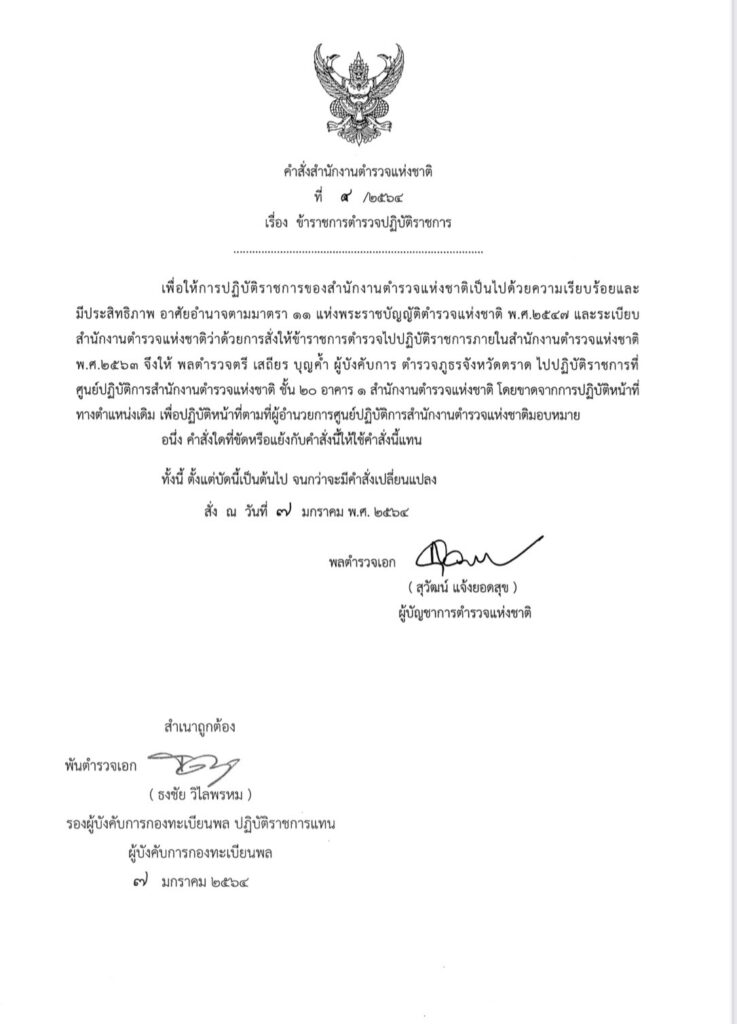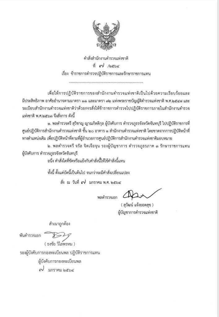 1.พล.ต.ต.สุวิชาญ ญาณกิตติกุล ผู้บังคับการ ตำรวจภูธรจังหวัดจันทบุรี ไปปฏิบัติราชการที่ศูนย์ปฏิบัติการสำนังานตำรวจแห่งชาติ ชั้น 20 อาคาร 1 สำนักงานตำรวจแห่งชาติ โดยขาดจากการปฏิบัติหน้าที่ทางตำแหน่งเดิม เพื่อปฏิบัติหน้าที่ตามที่ผู้อำนวยการศูนย์ปฏิบัติการสำนักงานตำรวจแห่งชาติมอบหมาย