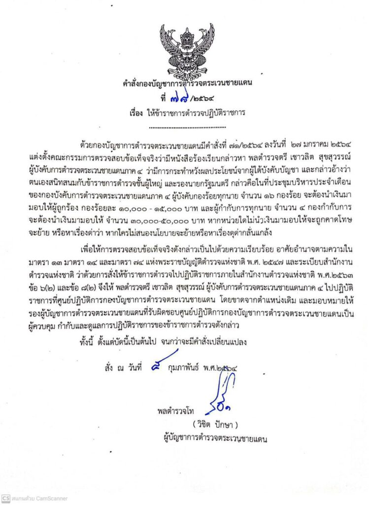 วันนี้(5 ก.พ.)มีรายงานว่า พล.ต.ท.วิชิต ปักษา ผู้บัญชาการตำรวจตระเวนชายแดน (ผบช.ตชด.) มีคำสั่งกองบัญชาการตำรวจตระเวนชายแดน ที่ 78/2564 ลงวันที่ 5 กุมภาพันธ์ เรื่อง ให้ข้าราชการตำรวจปฏิบัติราชการ ใจความว่า ด้วยกองบัญชาการตำรวจตระเวนชายแดน มีคำสั่งที่ 71/2564 ลงวันที่ 27 มกราคม 2564 แต่งตั้งคณะกรรมการตรวจสอบข้อเท็จจริงว่ามีหนังสือร้องเรียนกล่าวหา พล.ต.ต.เชาวลิต สุขสุวรรณ์ ผู้บังคับการตำวจตระเวนชายแดนภาค4(ผบก.ตชด.ภาค4) ว่า มีการกระทำหวังผลประโยชน์จากผู้ใต้บังคับบัญชา และกล่าวอ้างว่า ตนเองสนิทสนมก้ข้าราชการตำรวจชั้นผู้ใหญ่ และรองนายกรัฐมนตรี กล่าวคือในที่ประชุมบริหารประจำเดือนของกองบังคับการตำรวจตระเวนชายแดนภาค ๔ ผู้บังคับกองร้อยทุกนาย จำนวน 16 กองร้อย จะต้องนำเงินมามอบให้ผู้ถูกร้อง กองร้อยละ 10,000 -20,000 บาท และผู้กำกับการทุกนาย จำนวน ๔ กองกำกับการ จะต้องนำเงินมามอบให้ จำนวน 30,000 – 50,000 บาท หากหน่วยใดไม่นำงินมามอบให้จะถูกคาดโทษจะย้าย หรือหาเรื่องด่าว่า หากใครไม่สนองนโยบายจะย้ายหรือหาเรื่องดุด่ากลั่นแกล้ง
