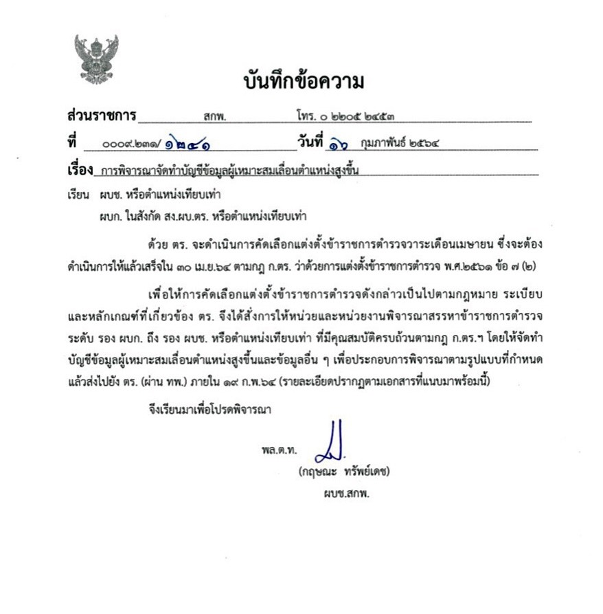 เมื่อวันที่ 18 ก.พ. 2564 ที่สำนักงานตำรวจแห่งชาติ(ตร.)ผู้สื่อข่าวรายงานว่า พล.ต.ท.กฤษณะ ทรัพย์เดช ผบช.สกพ.ได้มีคำสั่งเวียน เป็นบันทึกข้อความ ส่วนราชการ ลงวันที่ 16 กุมภาพันธ์ 2464 เรื่องการพิจรณาจัดทำบัญชีข้อมูลผู้เหมาะสมเลื่อนตำแหน่งสูงขึ้น ผบช. หรือตำแหน่งเทียบเท่า ผบก. ในสังกัด สง.ผบ.ตร. หรือตำแหน่งเทียบเท่า โดยในคำสั่งดังกล่าวระบุว่า: ด้วย ตร. จะดำเนินการคัดเลือกแต่งตั้งข้าราชการตำรวจวาระเดือนเมษายน ซึ่งจะต้องดำเนินการให้แล้วเสร็จใน 30 มย.64 ตามกฎ ก.ตร. ว่าด้วยการแต่งตั้งข้าราชการตำรวจ พศ.2561 ข้อ 7(2)เพื่อให้การคัดเลือกแต่งตั้งข้ราชการตำรวจดังกล่วเป็นไปตามกฎหมาย ระเบียบและหลักเกณฑ์ที่เกี่ยวข้อง ตร. จึงได้สั่งการให้หน่วยและหน่วยงานพิจารณาสรรหาข้าราชการตำรวจระดับ รอง ผบก. ถึง รอง ผบช. หรือตำแหน่งเทีบเท่ ที่มีคุณสมบัติครบถ้วนตามกฎ ก.ตร.ฯ โดยให้จัดทำบัญชีข้อมูลผู้เหมาะสมเลื่อนตำแหน่งสูงขึ้นและข้อมูลอื่น ๆ เพื่อประกอบการพิจารณาตามรูปแบบที่กำหนดแล้วส่งไปยัง ตร. (ผ่าน ทพ.) ภายใน 19 ก.พ.(รายละเอียดปรากฏตามเอกสารที่แนบมาพร้อมนี้)จึงเรียนมาเพื่อโปรดพิจารณา”หนังสือดังกล่าวระบุ”