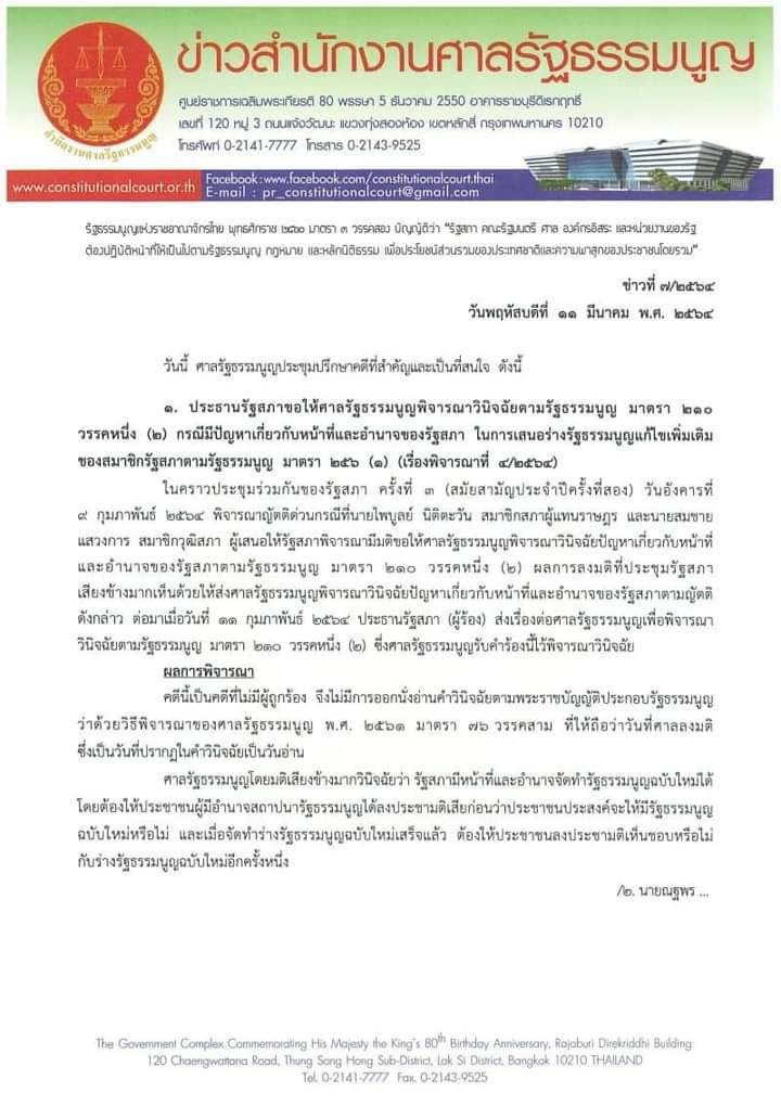 เมื่อวันที่ 11 มี.ค. ที่ศาลรัฐธรรมนูญ ผู้สื่อข่าวไทยแทบลอยด์ รายงานว่า ศาลรัฐธรรมนูญนัดลงมติพิจารณาคำร้องที่ประธานรัฐสภาขอให้ศาลรัฐธรรมนูญวินิจฉัยตามรัฐธรรมนูญ มาตรา 210 วรรคหนึ่ง (2) กรณีมีปัญหาเกี่ยวกับหน้าที่และอำนาจของรัฐสภา ในการเสนอร่างรัฐธรรมนูญแก้ไขเพิ่มเติมของสมาชิกรัฐสภาตามรัฐธรรมนูญ มาตรา 256 (1)