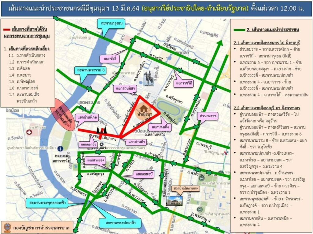 เส้นทางที่อาจได้รับผลกระทบจากการชุมนุมและควรหลีกเลี่ยง ถนนราชดำเนินกลาง, ถนนราชดำเนินนอก, ถนนดินสอ, ถนนตะนาว, ถนนพิษณุโลก, ถนนนครสวรรค์, สะพานสมเด็จพระปิ่นเกล้า