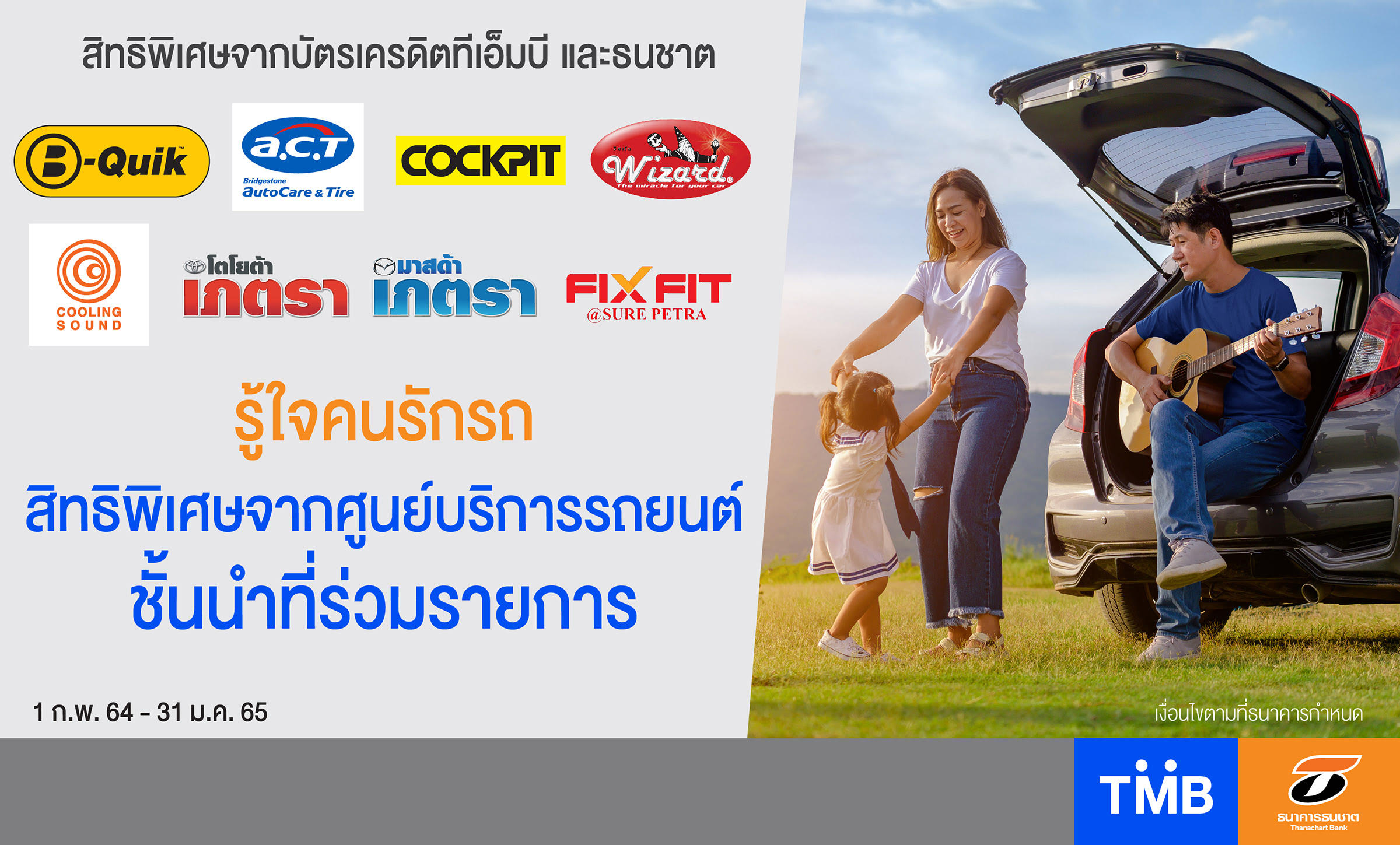 บัตรเครดิตทีเอ็มบี และบัตรเครดิตธนชาต รู้ใจคนรักรถ มอบสิทธิพิเศษการดูแลรักษารถ และส่วนลดให้คุณขับรถด้วยความอุ่นใจ ปลอดภัย จากศูนย์บริการรถยนต์ชั้นนำ ได้แก่ บี-ควิก, Cockpit, Bridgestone A.C.T., Wizard Auto Care Cooling Sound และ ศูนย์บริการรถยนต์ในเครือเภตรากรุ๊ป ตั้งแต่วันนี้ ถึง 31 มกราคม 2565