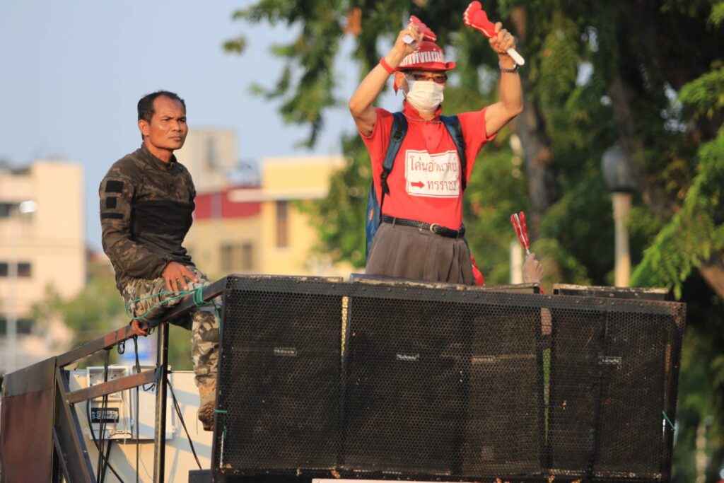 สำหรับบรรยากาศช่วง 17.45 น. ผู้ชุมนุมกลุ่มราษฎรและกลุ่มคนเสื้อแดงได้เข้ามาจับจองพื้นที่จนเต็นพื้นผิวจราจรราชดำเนินในและเริ่มล้นเข้าสู่พื้นที่ด้านในท้องสนามหลวง
