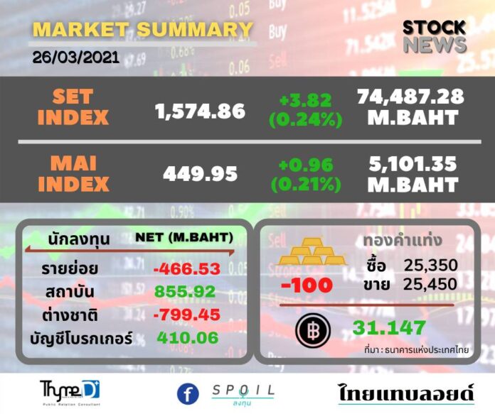ผู้สื่อข่าวรายงานว่า ดัชนีปิดตลาดวันนี้ (26 มีนาคม 64) ที่ระดับ 1,574.86 จุด เพิ่มขึ้น 3.82 จุด หรือ 0.24% มูลค่าการซื้อขาย 7.45 หมื่นล้านบาท ด้านนักลงทุนต่างชาติ ขายสุทธิ 799.45 ล้านบาท