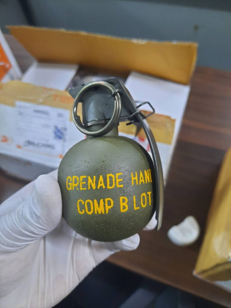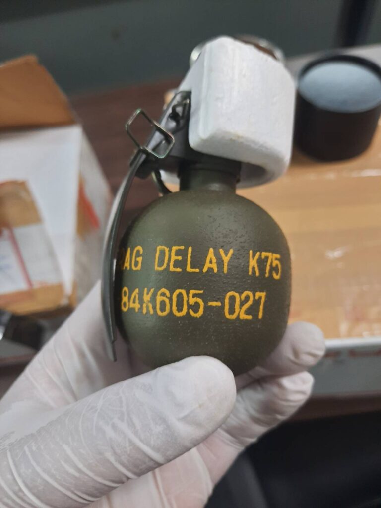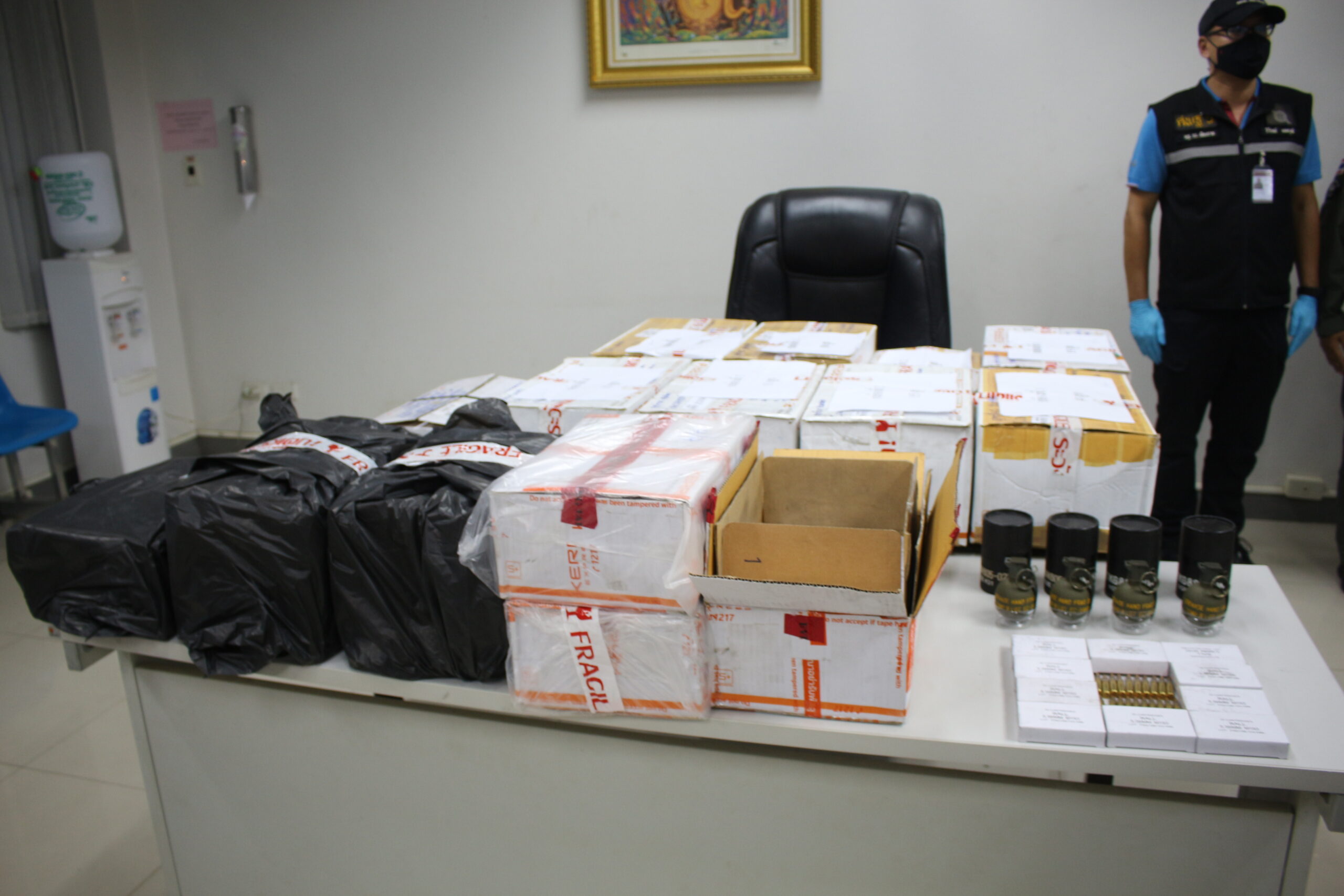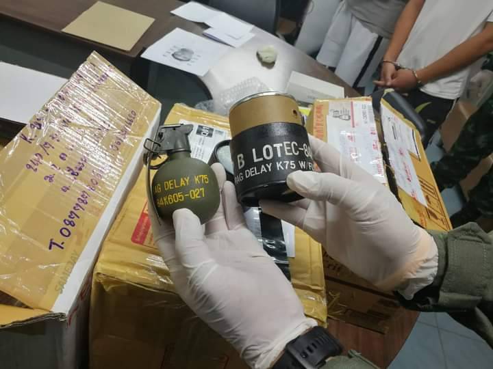 โดยก่อนหน้านี้ เมื่อวันที่ 28-29 มีนาคม ที่ผ่านมาเจ้าหน้าที่ตรวจพบลูกกระสุนปืนขนาด 5.56 มม. ที่ใช้กับปืนไรเฟิลกึ่งอัตโนมัติรุ่น M16 จำนวน 6,000 นัด ลูกระเบิดขว้างสังหารบุคคล รุ่น K 75 จำนวน 115 ลูก ในกล่องพัสดุ จากนั้น ได้ขยายผลไปจับนายมโนปกรณ์ สั่งสอน อายุ29 ปี ผู้ติดต่อขอรับพัสดุ และนายทรงศักดิ์ สิริชัยรุ่งเจริญ อายุ 31 ปี คนขับรถตู้ขนส่งสินค้าไปเมียนมา